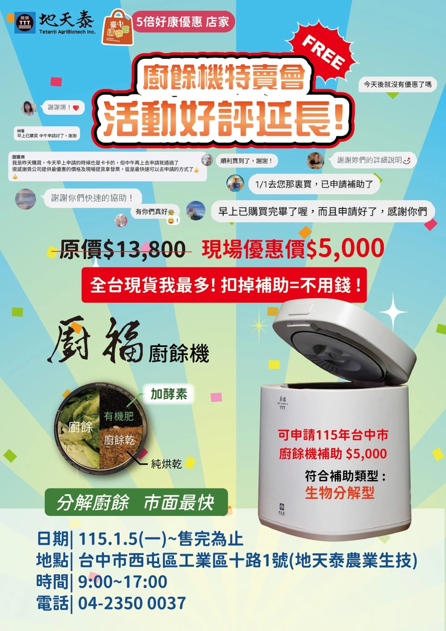 其中地天泰業者在台中工業區舉辦廚餘機特賣會,原價1萬3800元的廚福廚餘機現場優惠價5000元,扣掉市府補助後等於免費帶回家。業者向《知新聞》表示,補助政策上路後銷量大幅提升,目前仍有現貨供應。
