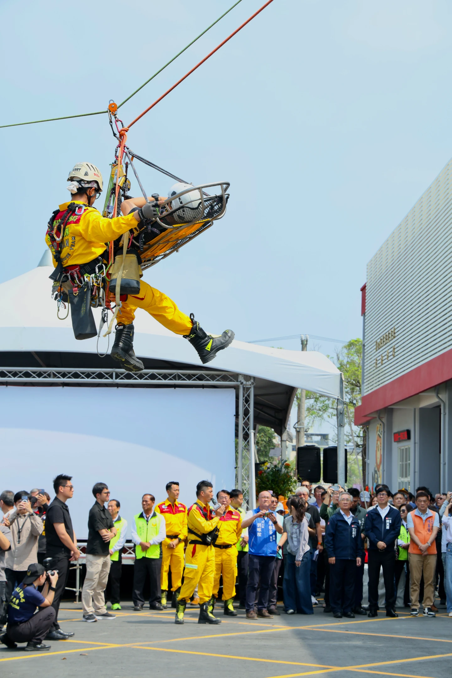 陳其邁也勉勵高雄繩索救援隊KRRT,肯定其於今年消防署舉辦的繩索救援競賽中,面對來自全球9個國家、12支頂尖隊伍激烈競逐,憑藉精湛技術與絕佳默契脫穎而出、勇奪冠軍,展現高雄消防繩索救援的國際級專業水準;他並感謝義消長期投入與協助,成為消防工作的重要後盾。