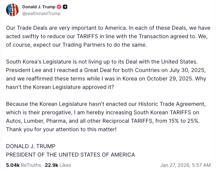 川普1月26日在個人社群平台發文,怒稱要把對南韓的汽車、木材、藥品以及其他所有品項的對等關稅稅率,從15%上調至25%;理由是「南韓國會沒有履行與美國達成的協議」,迄今尚未批准落實去年10月達成之雙邊關稅協議所需的立法。