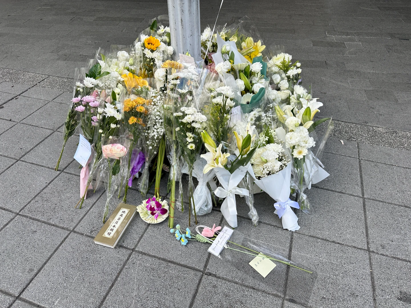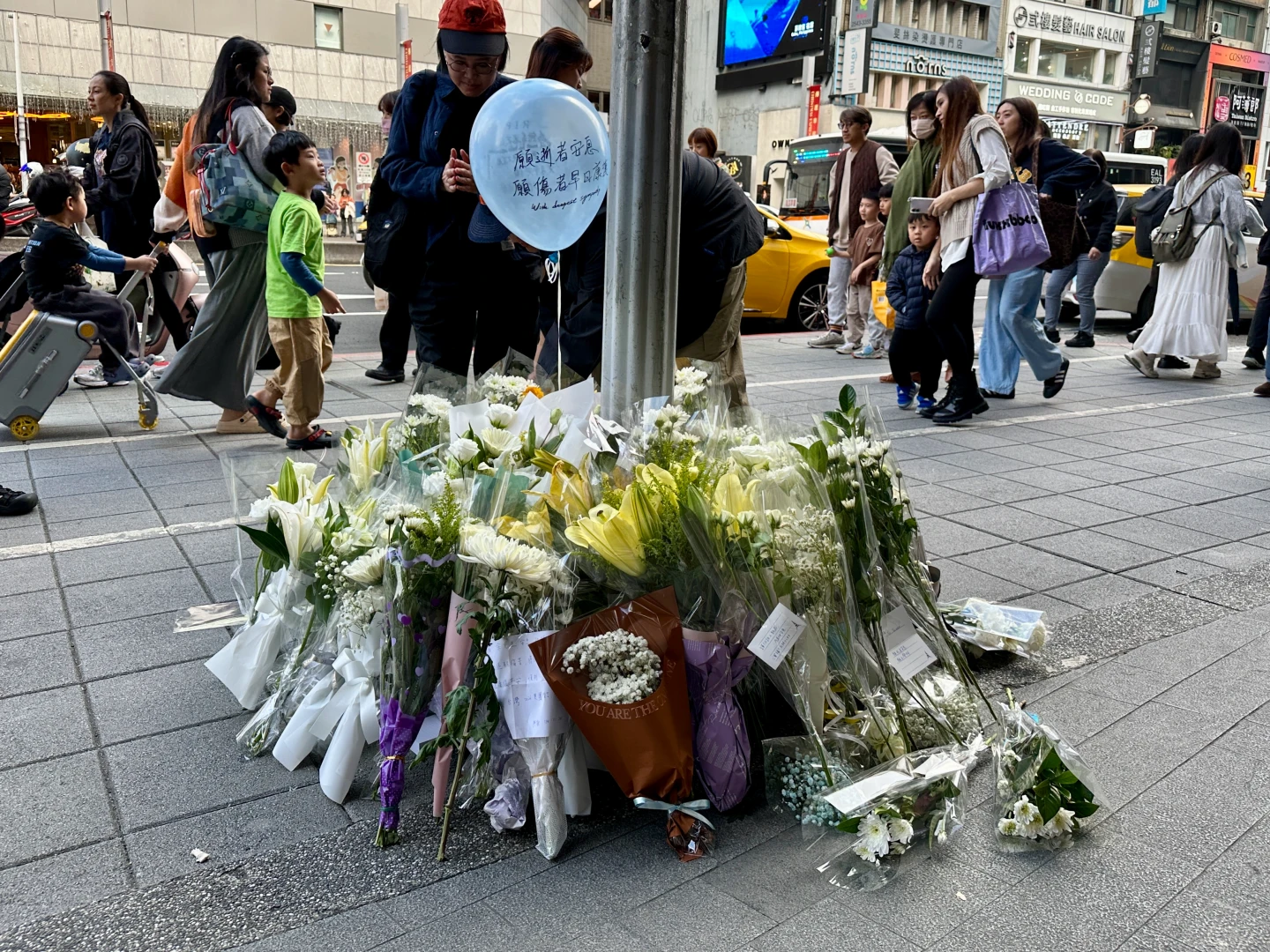 民眾送來的花束當中,有人在卡片上寫著「無辜的人,不該成為他人不滿或報復社會的陪葬品」,也有人誠心祝福「願逝者安息」,另有人盼逝者脫離痛苦、傷者康復平安。