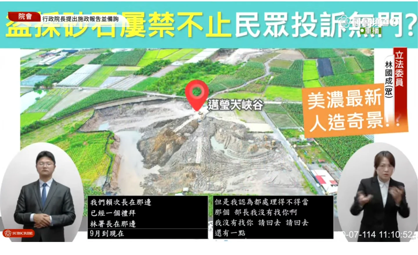林國成今在院會質詢卓榮泰與內政部長劉世芳,林指,盜採砂石嚴重破壞環境,中央、地方政府該督促、執行就該去落實,SOP很重要,院長要負很大責任,而林也透過簡報秀出美濃大峽谷照片,上頭更標註「邁瑩大峽谷」。