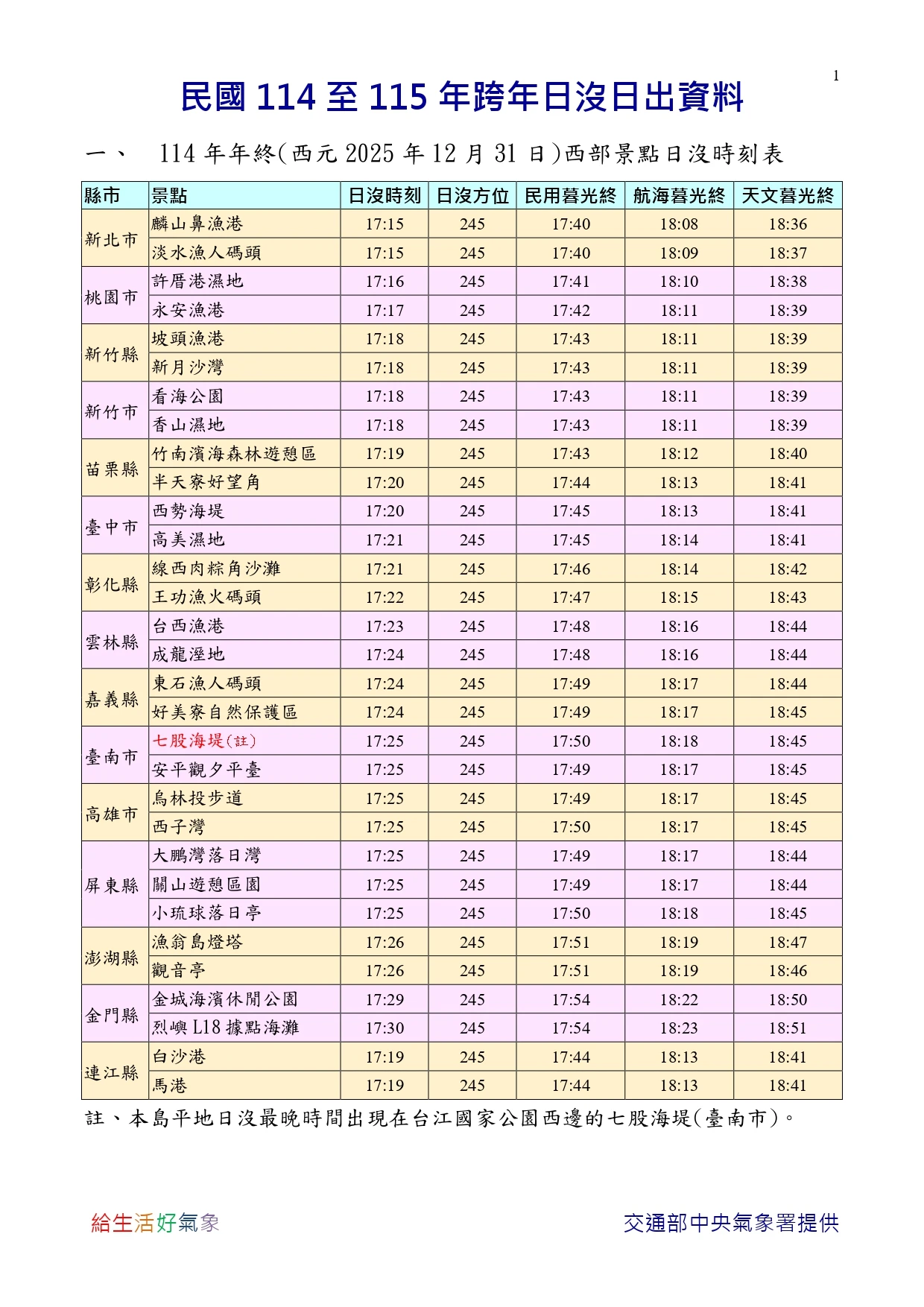 氣象署公布2025年到2026年跨年的日出、日落資料,對於2025年最後日落,氣象署表示,本島平地日落最晚時間,出現在台南市的台江國家公園西邊的七股海堤,時間為17:25。