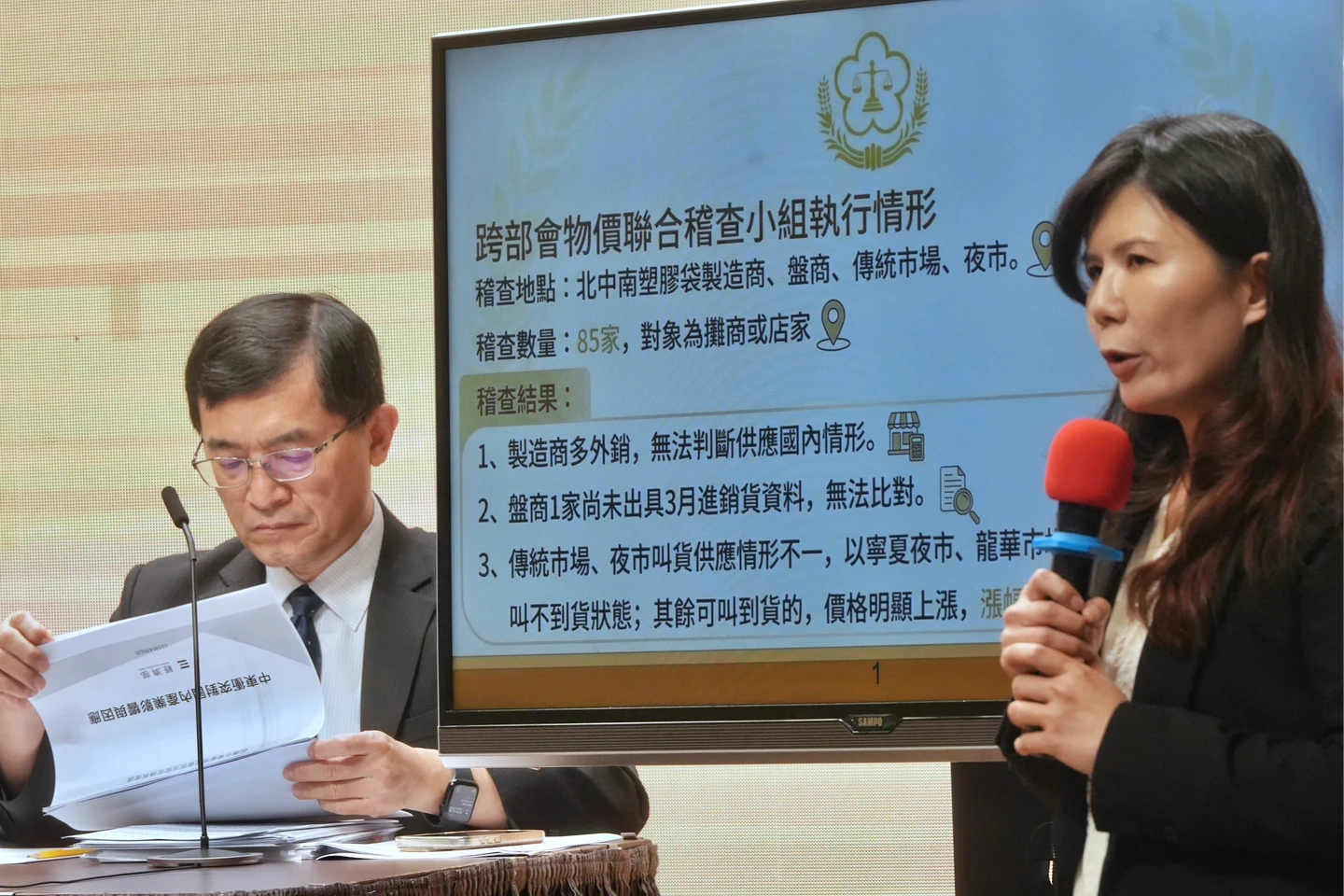 法務部檢察司主任檢察官蔡妍蓁表示,連假期間召開跨部會物價聯合稽查小組,4月3日執行第二次聯合稽查,本次稽查數量總計85家,稽查地點為北、中、南塑膠袋製造商、盤商、傳統市場及夜市,兩次稽查結果,有關於製造商部分,四家製造商多為外銷,目前尚無法判斷供應國內的狀況,有關於盤商部分,因為尚未出具3月份進銷貨資料,因此還無法比對。