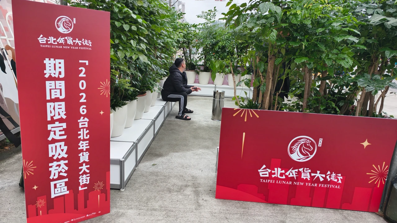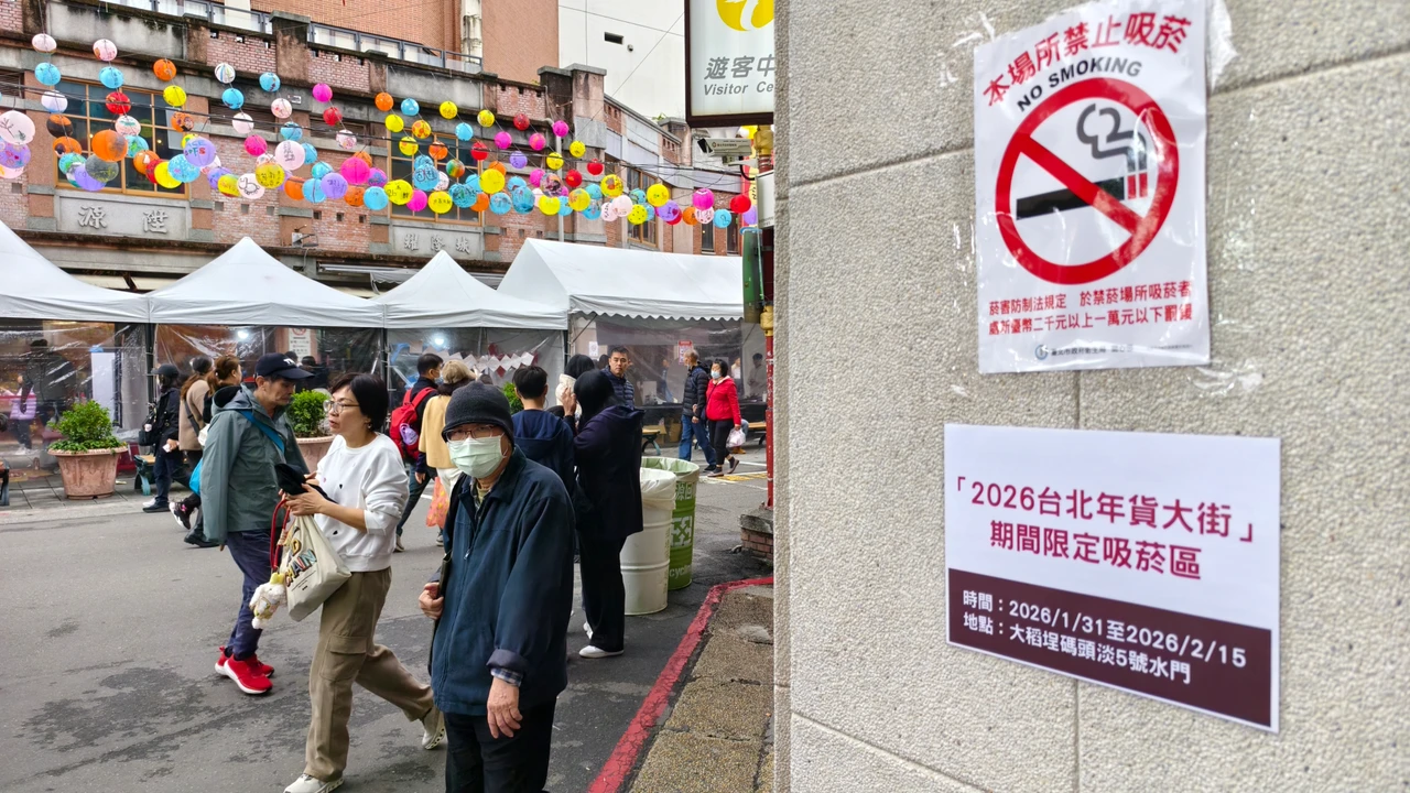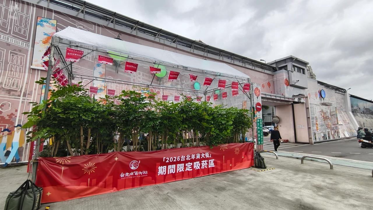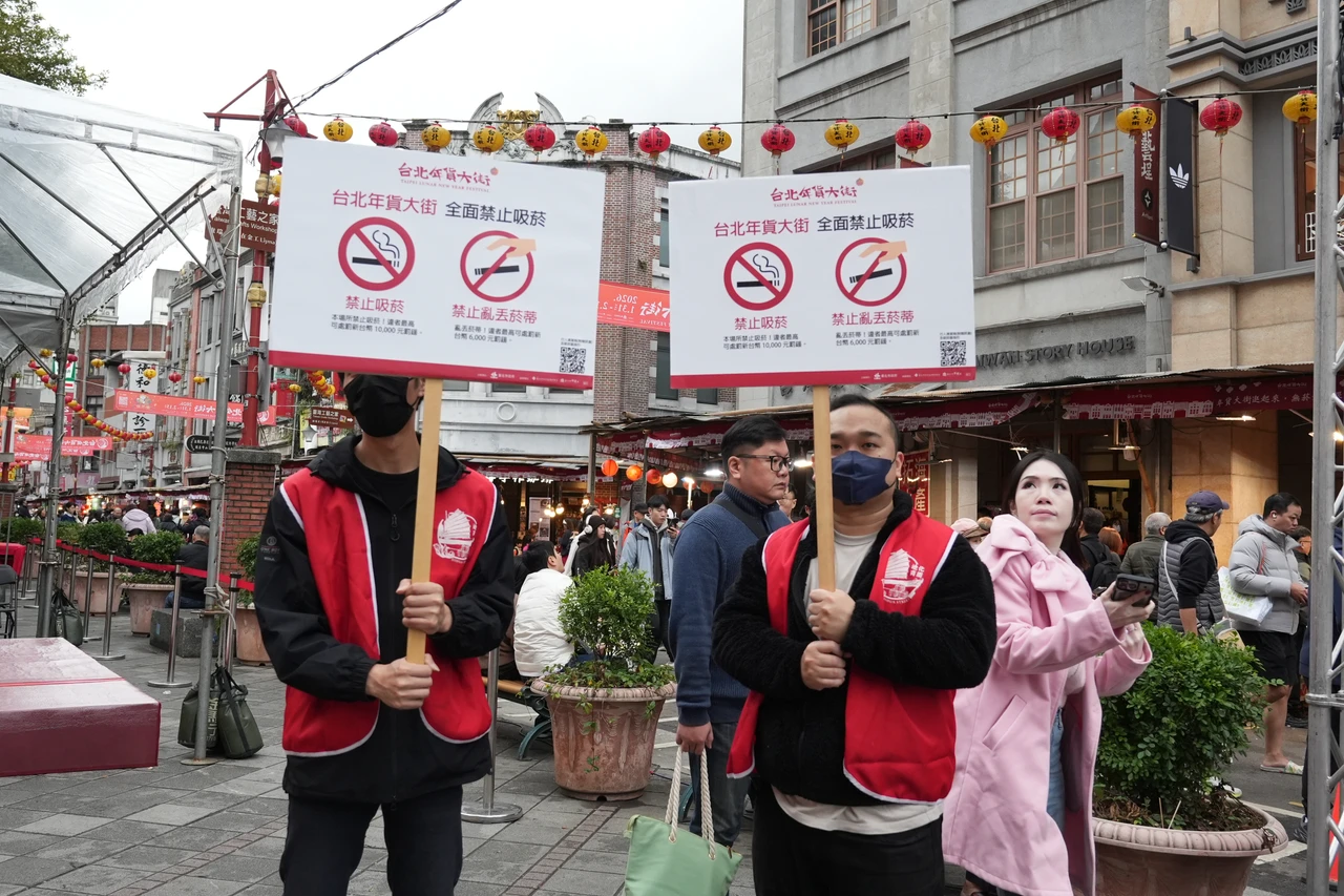 為打造無菸城市首個示範點,台北市政府公告「2026台北年貨大街」自1月31日至2月15日(每日8時至24時)為全面禁止吸菸場所,並在大稻埕碼頭5號水門旁廣場設立活動臨時吸菸區。