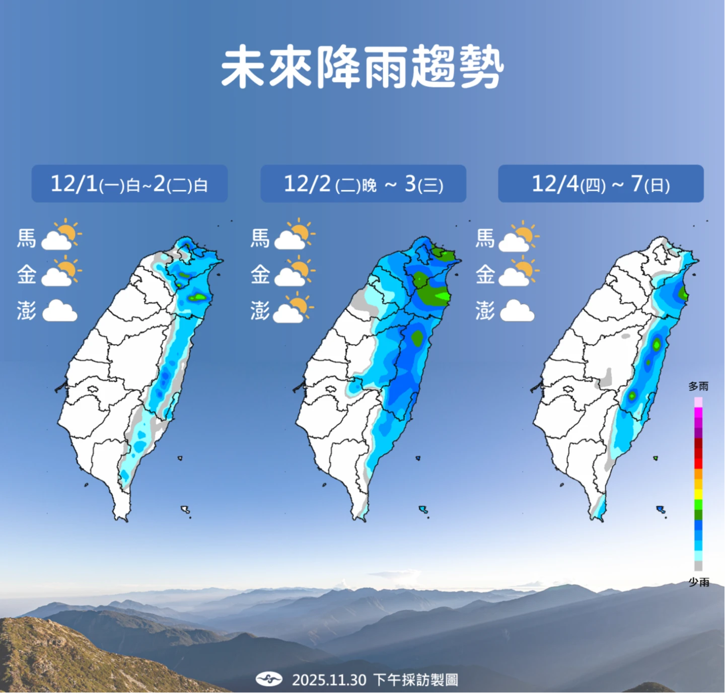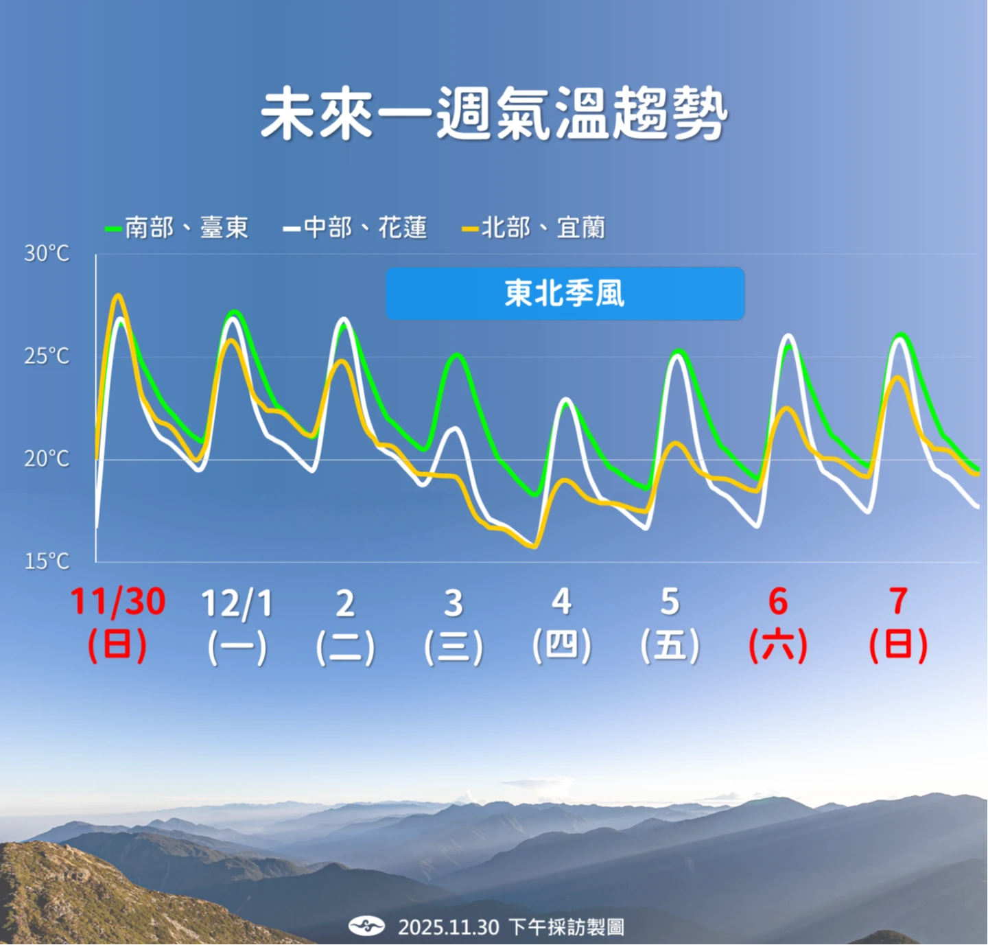 北部與宜蘭明晚起將降至16~21°C,中部約16~23°C,南部18~26°C;花蓮19~21°C、台東20~23°C,金門與馬祖也將明顯降至14~18°C及13~16°C。周四至周五(12月4~5日)東北季風仍持續影響,北部及宜花天氣偏涼,清晨與夜晚更有涼意。水氣略減,但基隆北海岸、台北山區、東半部與恆春半島仍有零星短暫雨,其他地區多雲到晴。此期間北部、宜花高溫約16~22°C,中南部落在15~26°C。