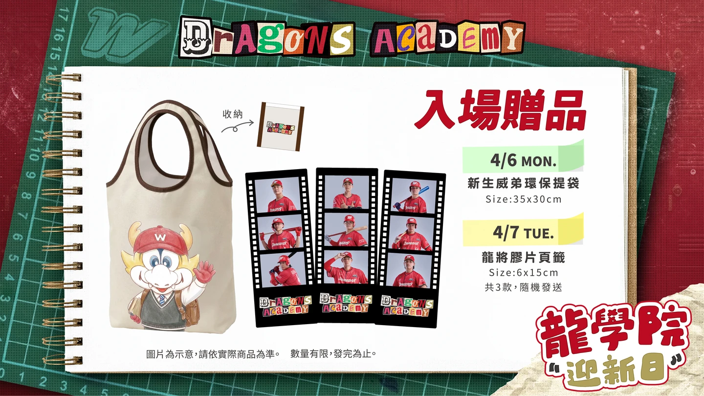 為了歡迎新球季入學的龍迷,龍學院特別準備了兩款專屬入學贈品,讓所有同學都能裝備齊全。包含 4月6日贈送的「新生威弟環保提袋」,以及4月7日贈送的「龍將膠片頁籤」款式隨機發送,數量有限贈完為止。