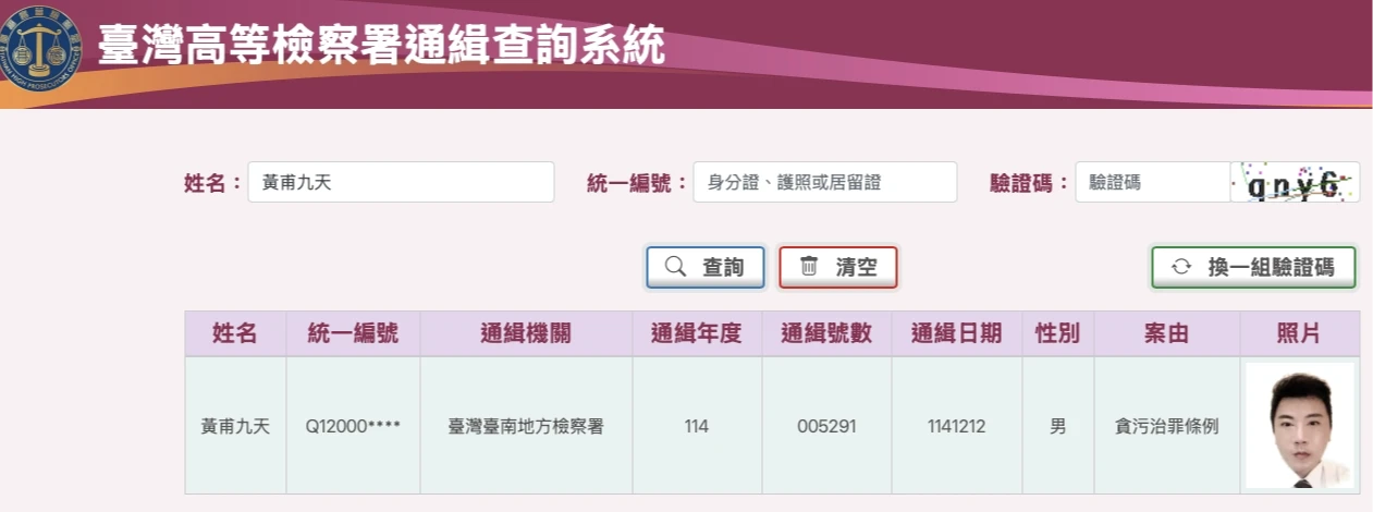 黃甫九天遭通緝。取自高檢署官網