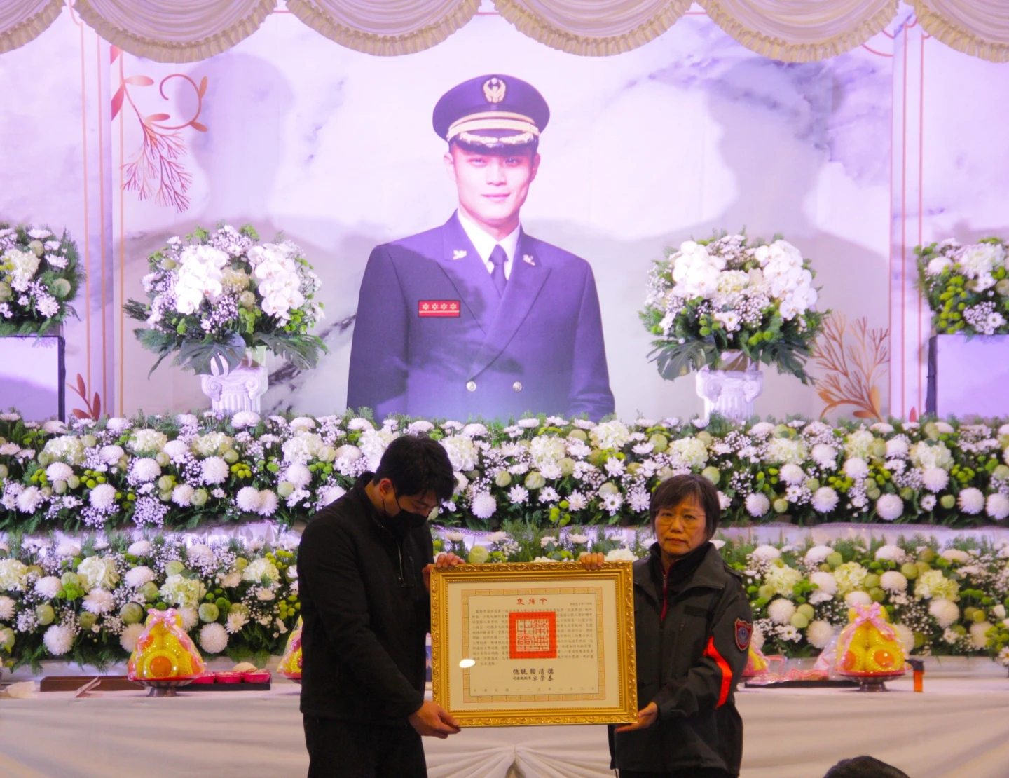 【記者於維奕/綜合報導】基隆市樂利三街「台北生活家」上月21日晚間發生大火,41歲仁愛分隊小隊長詹能傑3度進入火場救援,將氧氣面罩讓給受困火場的女子使用,遭濃煙嗆昏殉職。今(3日)天舉行公祭,內政部長劉世芳率消防署長蕭煥章等人主祭,為詹能傑覆蓋消防旗和國旗並頒授褒揚令、獎章和追晉分隊長。