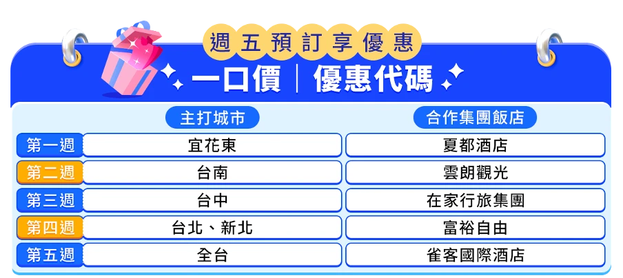 12月多國偶像、巨星歌手如OneRepublic、玟星、蔡依林等接連在台開唱,同時各縣政府自聖誕到跨年也邀集強檔音樂卡司週週演出。對此,Trip.com推出12月限定飯店優惠,每周五預訂享該周主打城市指定飯店999元起一口價、專屬折扣優惠碼,例如即日起主打城市「台中」,12月22日主打城市為「雙北」,12月29日起則開放全台各城市,以及雲朗觀光、凱撒飯店、富裕自由、日光集團、雀客國際等多家知名集團飯店限量優惠價。