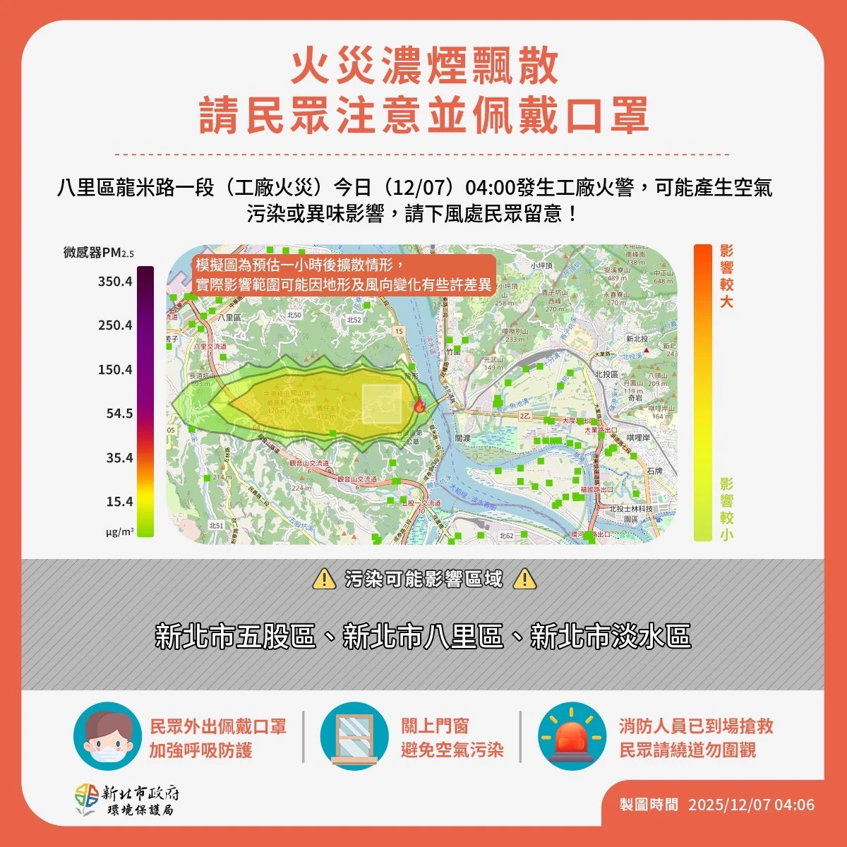 新北市環保局提醒,經模式模擬煙霧及部分異味可能往下風處飄散,預估影響範圍包括五股區、八里區、淡水區。鄰近居民緊閉門窗、外出記得配戴口罩,避免發生身體不適、保護呼吸道健康;另因大氣條件變化快,環保局將持續監控更新空品變化,啟動相關應變作為。