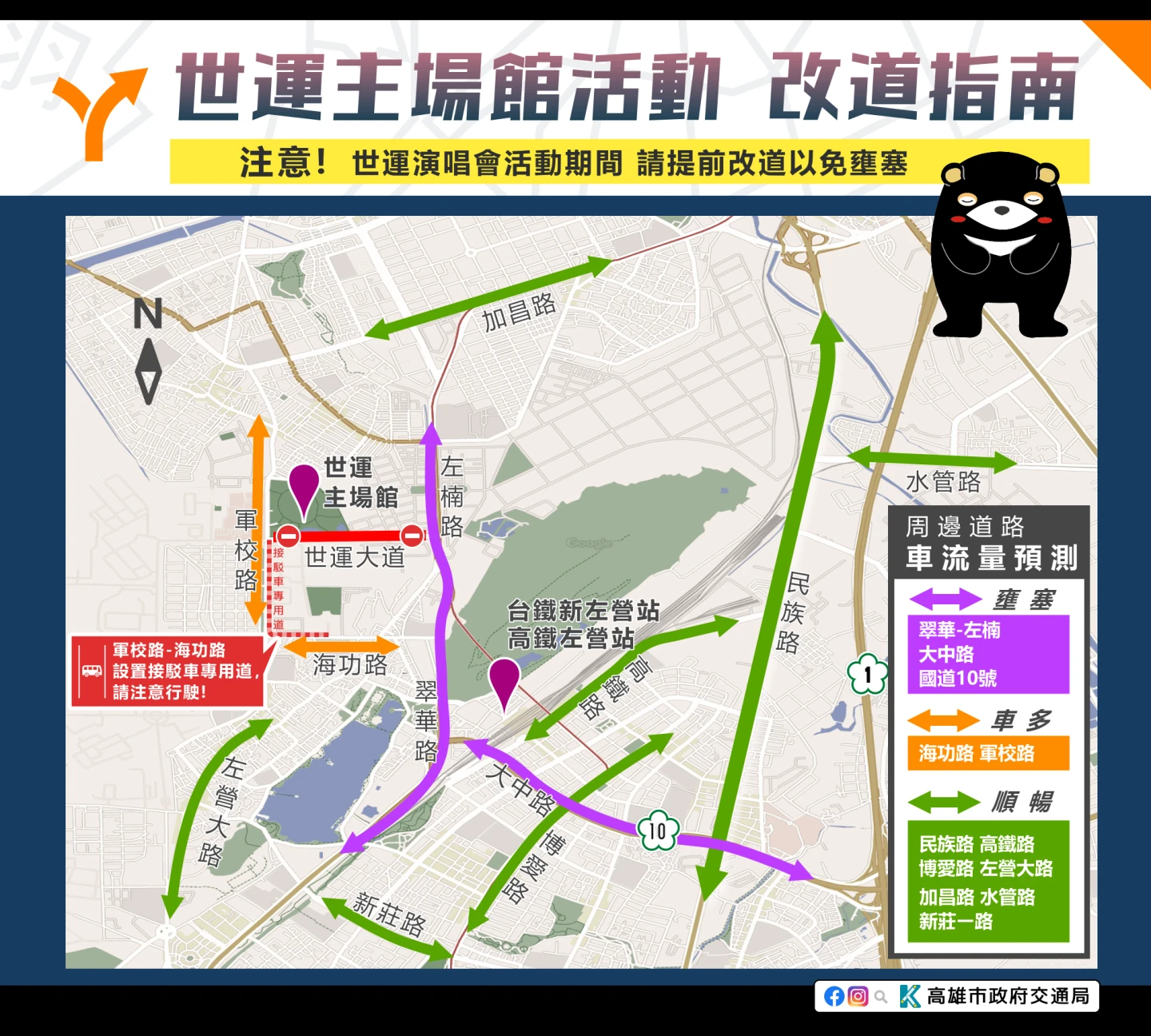 交通局提醒,活動期間,預計左楠路、翠華路、軍校路及國道10號將出現車多壅塞,建議駕駛提前改道,南北方向請多利用民族路、博愛路、高鐵路;東西方向可改道至加昌路、新莊一路、水管路。