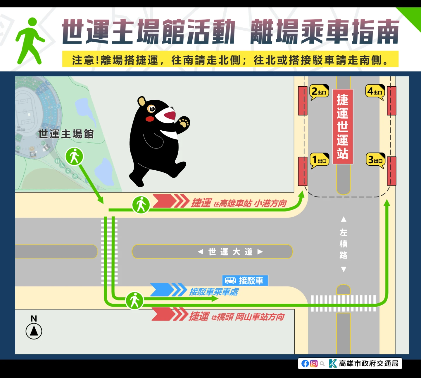 交通局再次提醒,會場周邊道路禁止臨停接送,警察局將加強違規停車拖吊取締,若有接送需求,請多利用生態園區站或都會公園站等周邊捷運站。若民眾騎機車前往,可停放在世運主場館西南側、軍校路(世運大道至海功路)西側及軍校路西側眷村(緯一路至緯四路)等臨時停放區。開放時間為每日上午8時至晚間11時,務必準時離場。