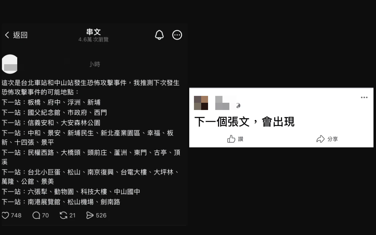 據悉,林姓男子(34歲)目前無業,有妨害秩序前科。昨天晚上7時許他分別在社群平台Threads、臉書散佈「下一個張文,會出現這」及「台北車站和中山站發生恐怖攻擊事件,我推測下次發生恐怖攻擊事件的可能地點」並羅列雙北各大捷運站、知名景點、南港展覽館、松山機場等地。