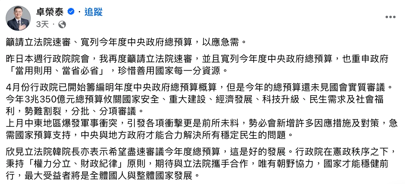 卓榮泰説,4月份行政院已開始籌編明年度中央政府總預算概算,但今年度總預算還未見到國會實質審議。卓榮泰提,今年3兆350億元總預算攸關國家安全、重大建設、經濟發展、科技升級、民生需求及社會福利,勢難割裂分批、分項審議。