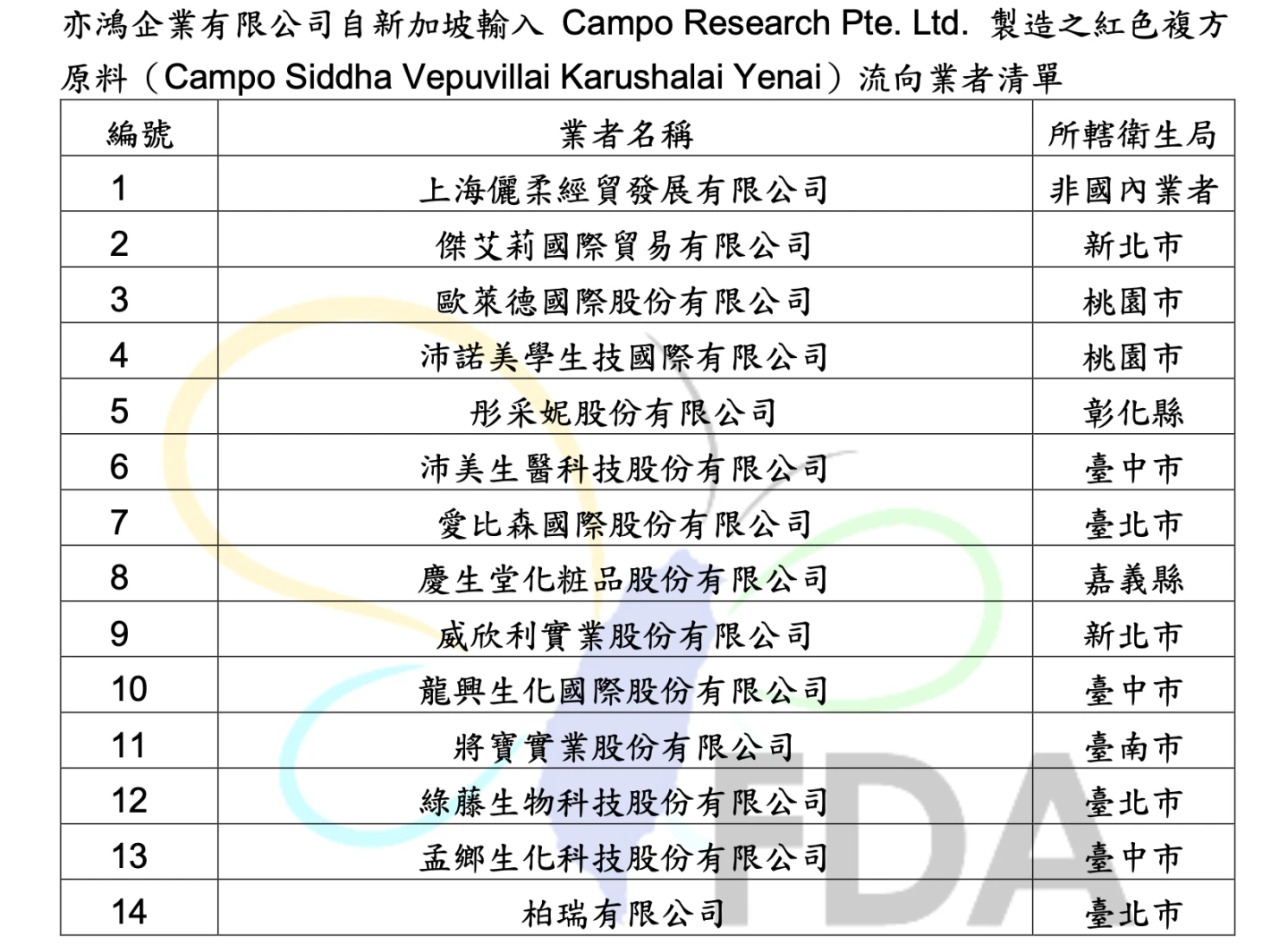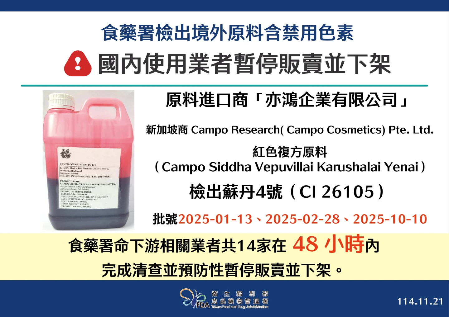 為掌握原料流向,食藥署11月19日會同新北市衛生局赴原料進口商亦鴻公司稽查,當場查扣及封存該公司自新加坡輸入 Campo Research( Campo Cosmetics) Pte. Ltd. 製造之疑似問題紅色複方原料5批,命業者不得再供應、移動或使用,國家實驗室於11月20日確認其中3批(批號2025-01-13、2025-02-18、2025-10-10)原料均檢出禁用色素:蘇丹4號。