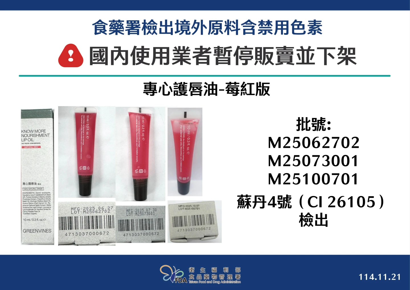 食藥署也在11月12日接獲綠藤生物科技公司主動通報,其產品「專心護唇油-莓紅版」(批號: M25062702、M25073001、M25100701)疑檢出蘇丹4號(CI 26105),後經食藥署國家實驗室於11月21日進一步檢驗確認檢出禁用色素。