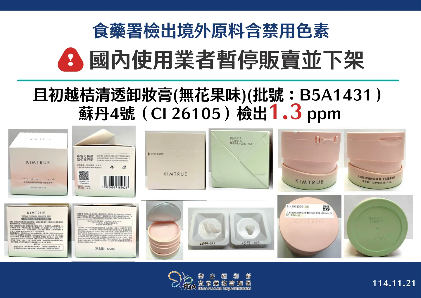 食藥署副署長王德原說明,透過圖形比對,鎖定momo電商平台上一款疑似問題產品「且初越桔清透卸妝膏(無花果味)」,11月初下單購買送交研檢組,研檢組花了10天建立檢驗方法,並於11月17日確認該批號:B5A1431(產地:中國)檢出禁用色素蘇丹4號1.3 ppm,立即要求電商全面下架問題產品,並將販售業者歐妮公司移請所轄衛生局裁處。
