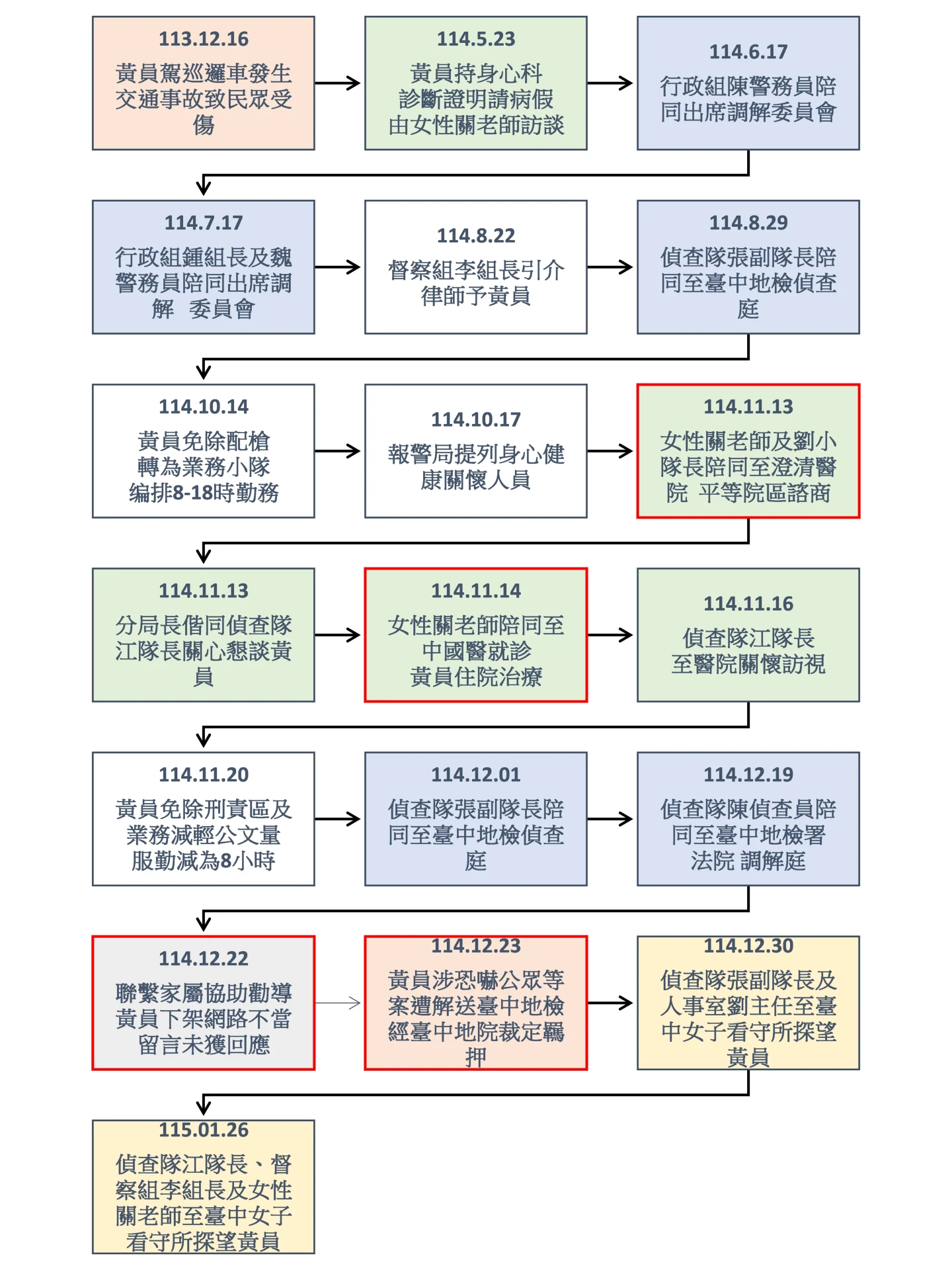 對此,台中市警二分局繼昨(26)日提出四點澄清後,今天再度發布五點說明強調,黃員於2024年間交通事故發生後,分局即依規定啟動員警關懷與協助機制,協助處理行政、司法及調解程序,並非外界所稱冷處理;相關作為均有具體時序紀錄,可供司法機關查證。