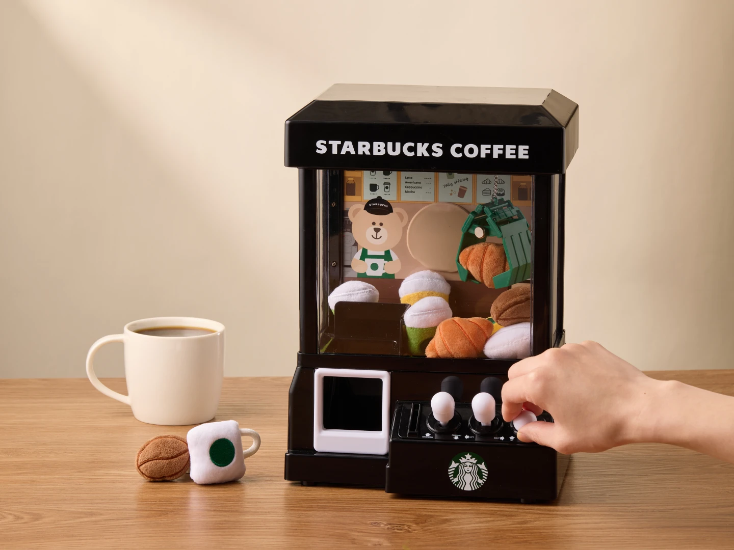星巴克品牌夾娃娃機新登場!星巴克表示,1月14日起於指定門市,以原價購買2杯大杯(含)以上全品項飲料,再加購2,680元,即可獲得品牌夾娃娃機乙台。以咖啡豆、咖啡杯與可頌等經典咖啡廳元素,化身為可愛的抓取娃娃,將熟悉的咖啡日常轉化為充滿驚喜的互動體驗。