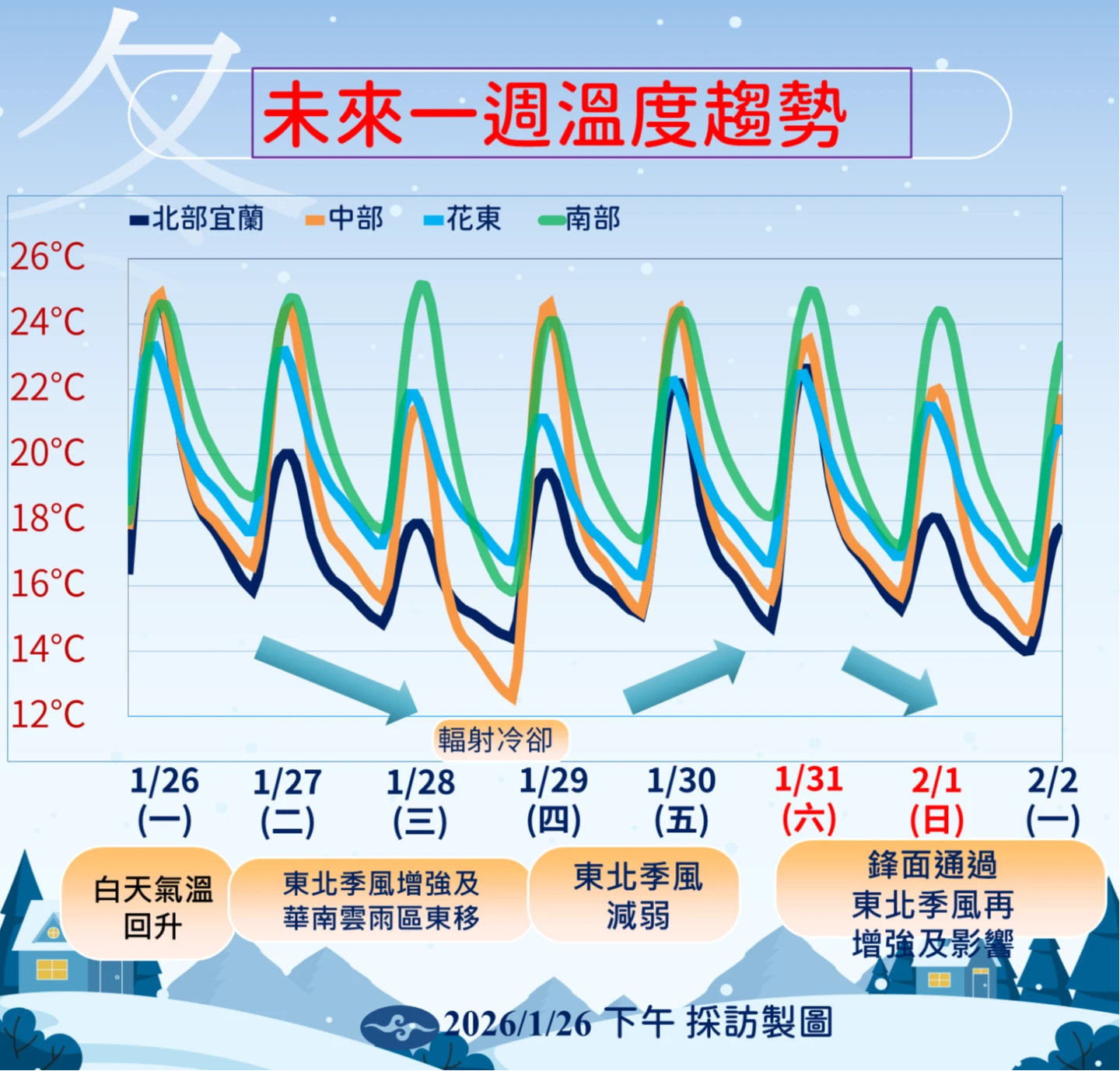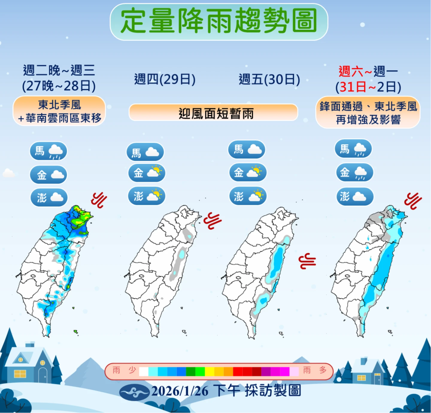 周三(28日)雖仍受東北季風影響,但白天起水氣逐漸減少,西半部轉為零星短暫雨後多雲的天氣。周四(29日)東北季風減弱,白天氣溫回升,但受「輻射冷卻」效應影響,早晚天氣依然偏冷,中部以北、宜蘭及金門低溫約11至15°C,馬祖僅10至11°C,中南部日夜溫差顯著。周五(30日)是本周天氣最穩定的一天,各地多為多雲到晴,僅東半部有零星降雨。