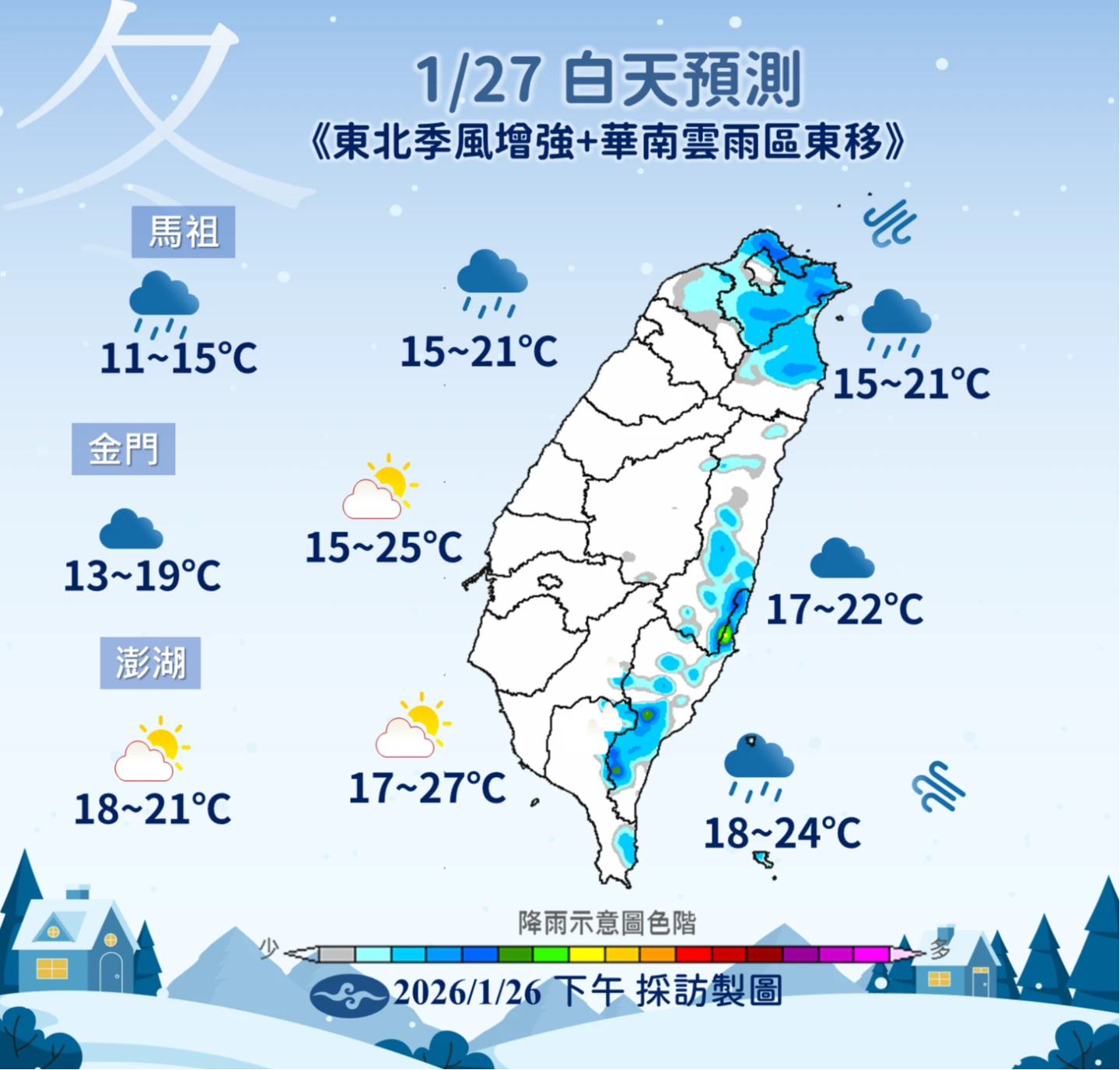 北部及東半部高溫約19至23°C,中南部白天仍可達22至27°C,但夜間快速降溫,中部以北及東北部低溫約15至16°C,南部及花東約17至18°C。若低溫與水氣條件配合,3000公尺以上高山有零星降雪機率。