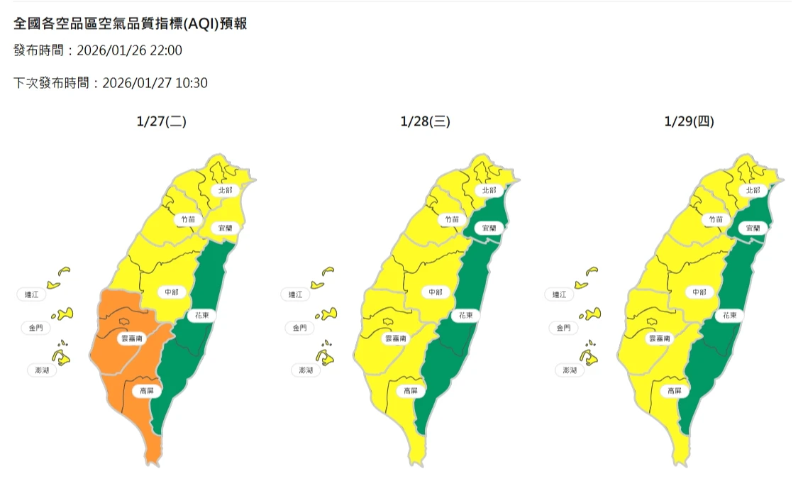 今晚起東北風可能挾帶微量境外污染物移入影響臺灣及離島,中南部位於下風處,污染物稍易累積,雲嘉南及高屏等5縣市,空品區為「橘色提醒」等級,其他縣市為普通至良好等級。