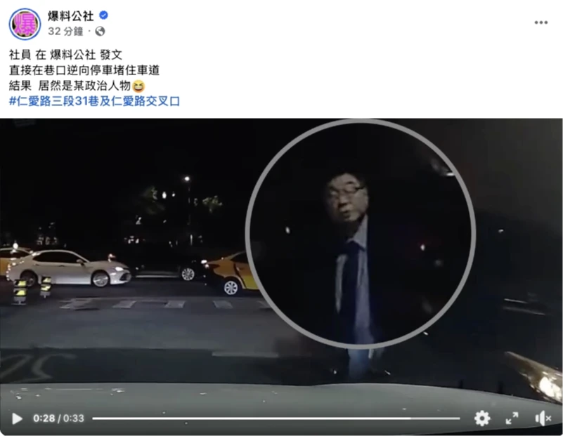 該段行車記錄器畫面被轉發到臉書粉專爆料公社:「直接在巷口逆向停車堵住車道,結果居然是某政治人物。」畫面在網路上瘋傳後,迅速引發社群網友熱議。