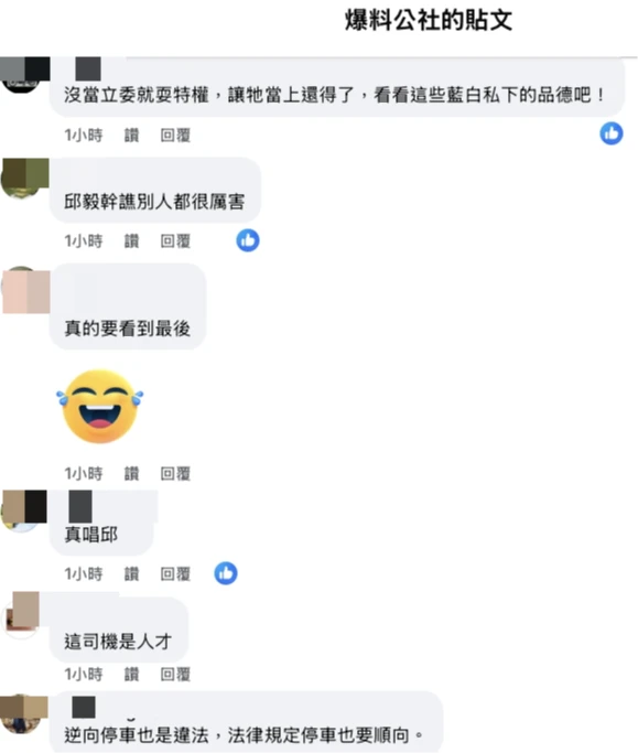 網友留言酸度爆表,質疑「秋義耶,沒順便開過去,扯掉他的頭髮??」、「邱毅,他不是終國人電視節目固定班底嗎」、「真唱邱」、「國民黨老鼠屎,滾」、「停這樣也真的是夠了!不送紅單對不起他」、「要去拜拜遇到髒東西」、「沒當立委就耍特權,讓牠當上還得了,看看這些藍白私下的品德吧!」