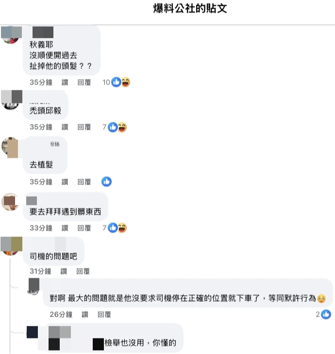 有網友說:「司機的問題吧」。其他人回應:「對啊,最大的問題就是他沒要求司機停在正確的位置就下車了,等同默許行為☹️」。