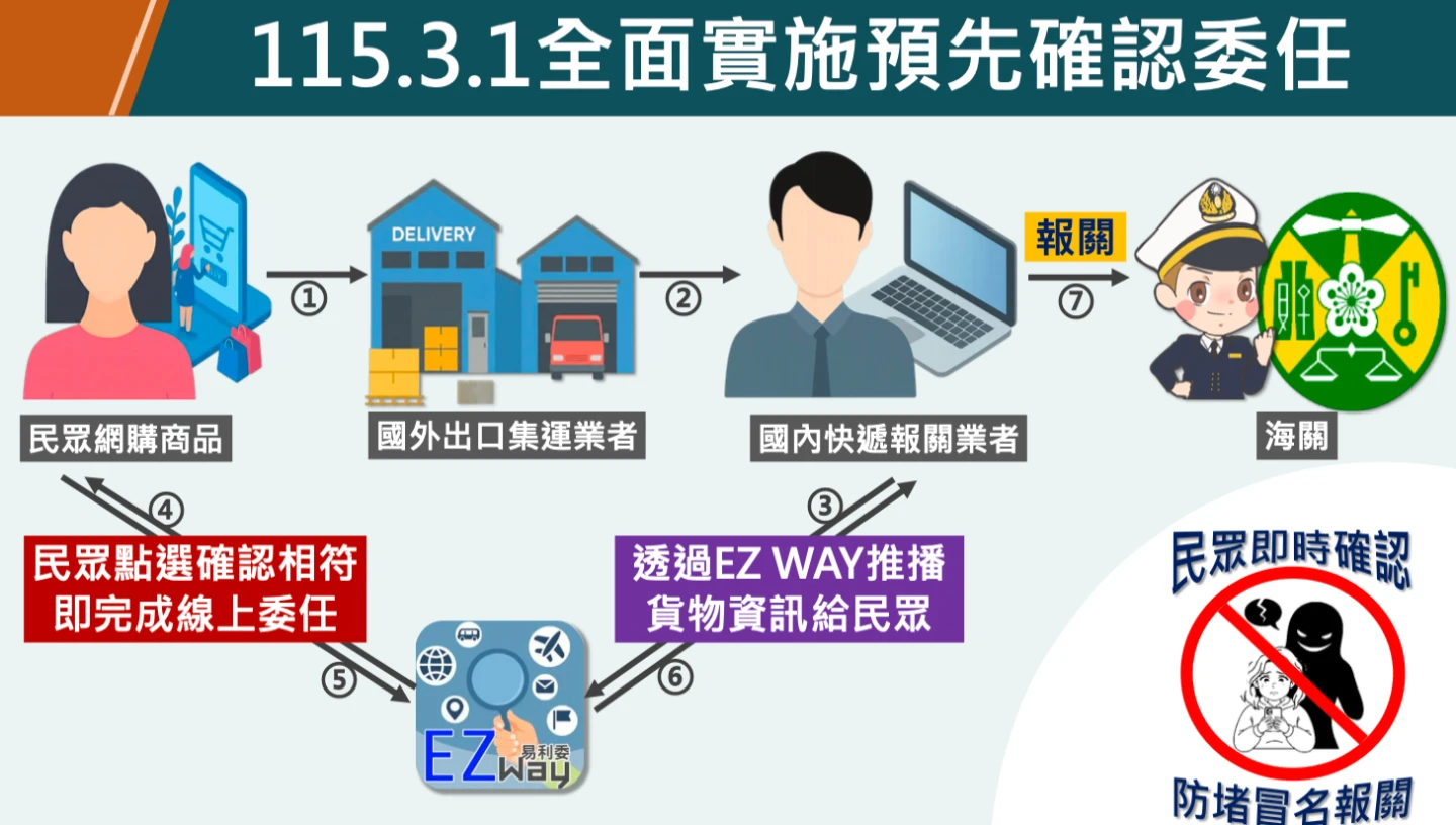 【記者林巧雁/台北報導】為打擊冒名報關,財政部今天宣布明年3月1日起,所有簡易申報進口快遞貨物,報關前須完成預先確認委任,網購境外商品須先利用實名認證APP「EZ WAY易利委」,確認與實際購買的商品相符,如果沒有完成委任報關,貨物無法通關進口。