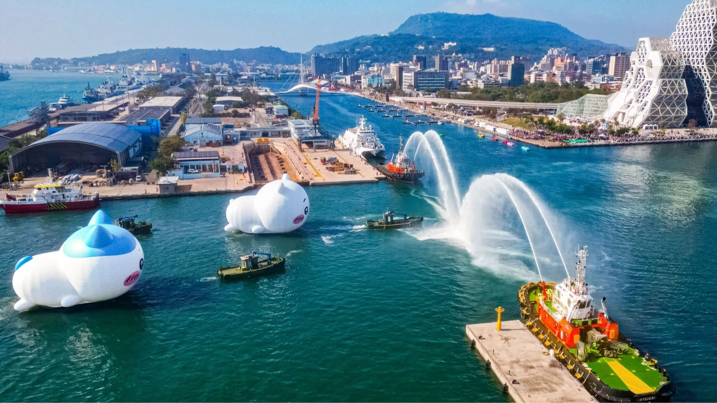 2025 Kaohsiung Wonderland 高雄冬日遊樂園」活動以最盛大、隆重的水門迎賓儀式迎接來自日本的吉伊卡哇(Chiikawa)、小八貓蒞臨愛河灣。取自FB@高雄市政府Kaohsiung City Government