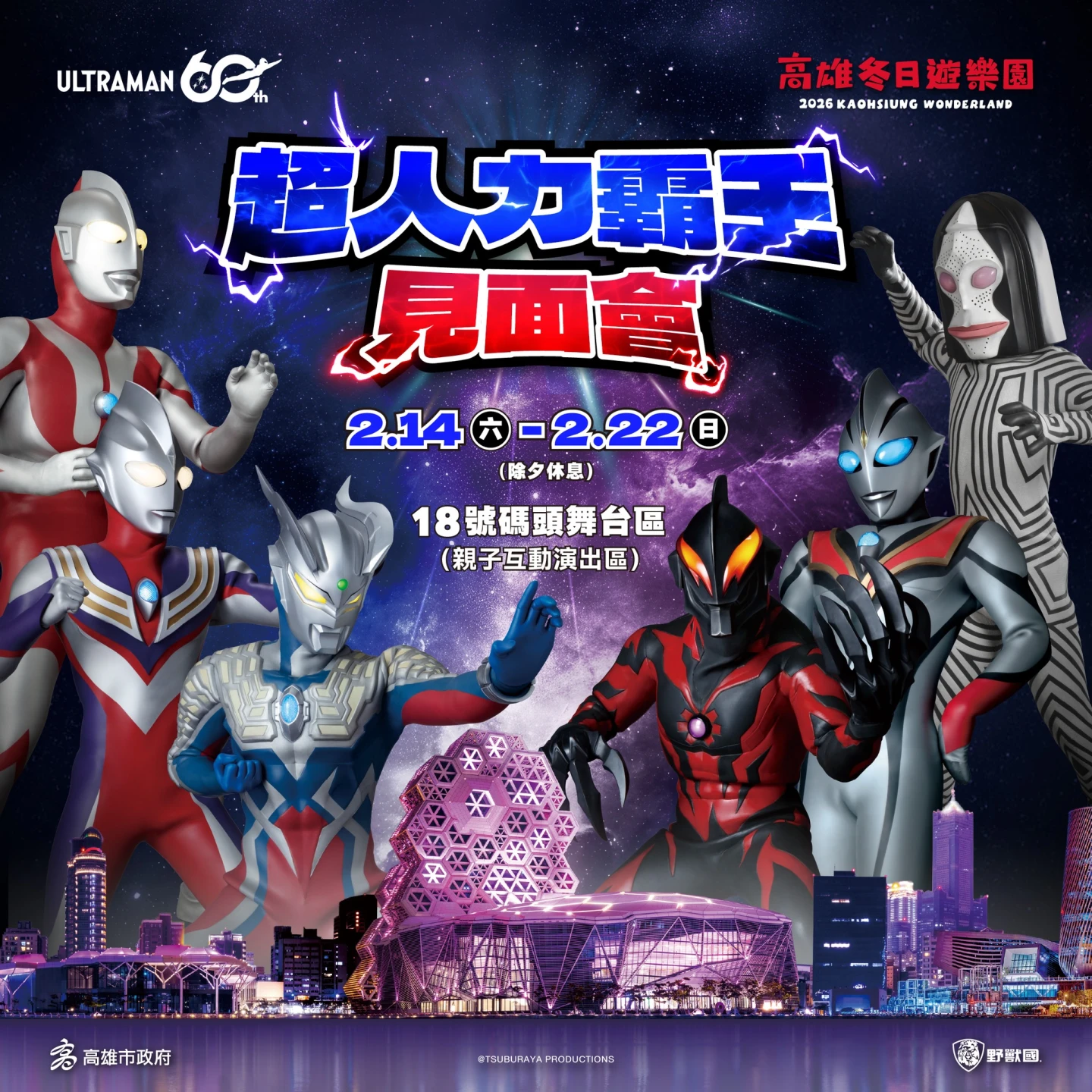 2026高雄冬日遊樂園於2月14日至22日(除夕休息)在18號碼頭舞台區推出限定超人力霸王見面會,免遊園券、免費觀賞,親子近距離互動成為春節亮點之一。取自FB@高雄市政府文化局