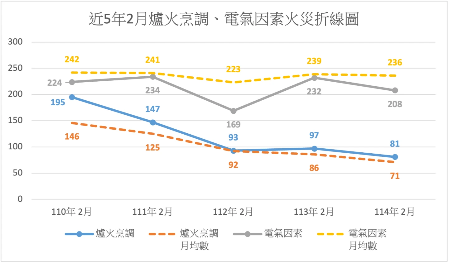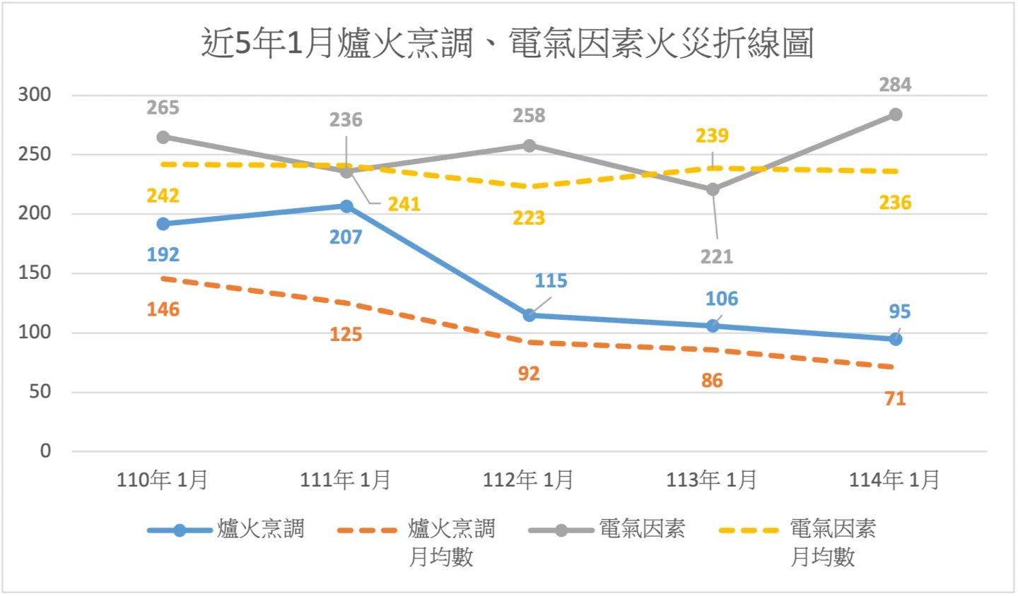 消防署另發現,2021年至2025年間,1月電氣因素火災共發生1264次,2月發生1067次;1月份電氣因素火災自2024年起微幅上升,2月份電氣因素火災則自2024年起有微幅下降趨勢。