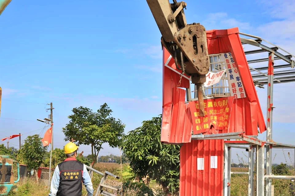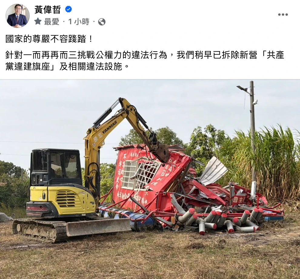 市長黃偉哲稍早在臉書發文強調,「國家的尊嚴不容踐踏!針對一而再、再而三挑戰公權力的違法行為,我們稍早已拆除新營『共產黨違建旗座』及相關違法設施。」