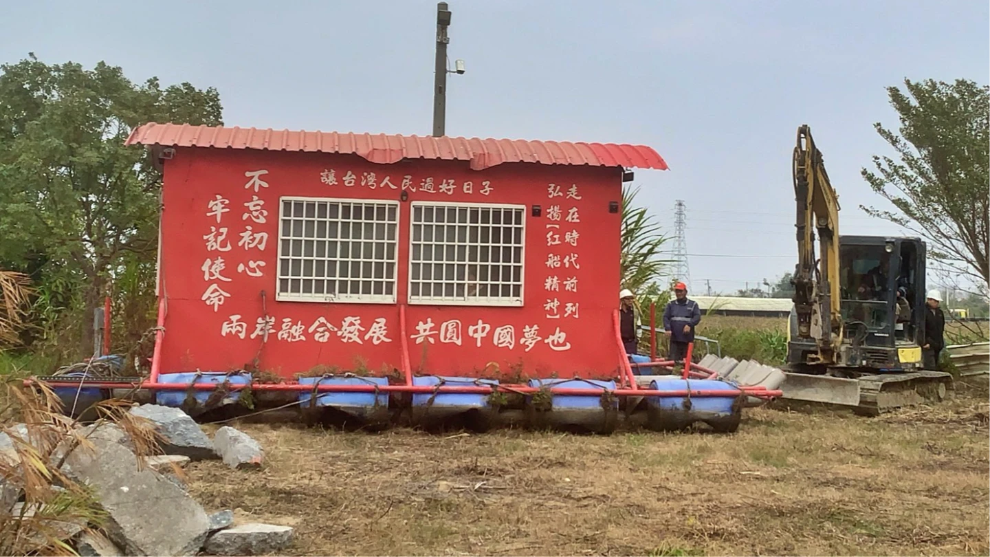 時隔不到5年,空地上又出現「紅船」,印有「二岸融合發展 共圓中國夢也」等標語。市府於今天上午執行第3次強制拆除作業,過程平和順利。
