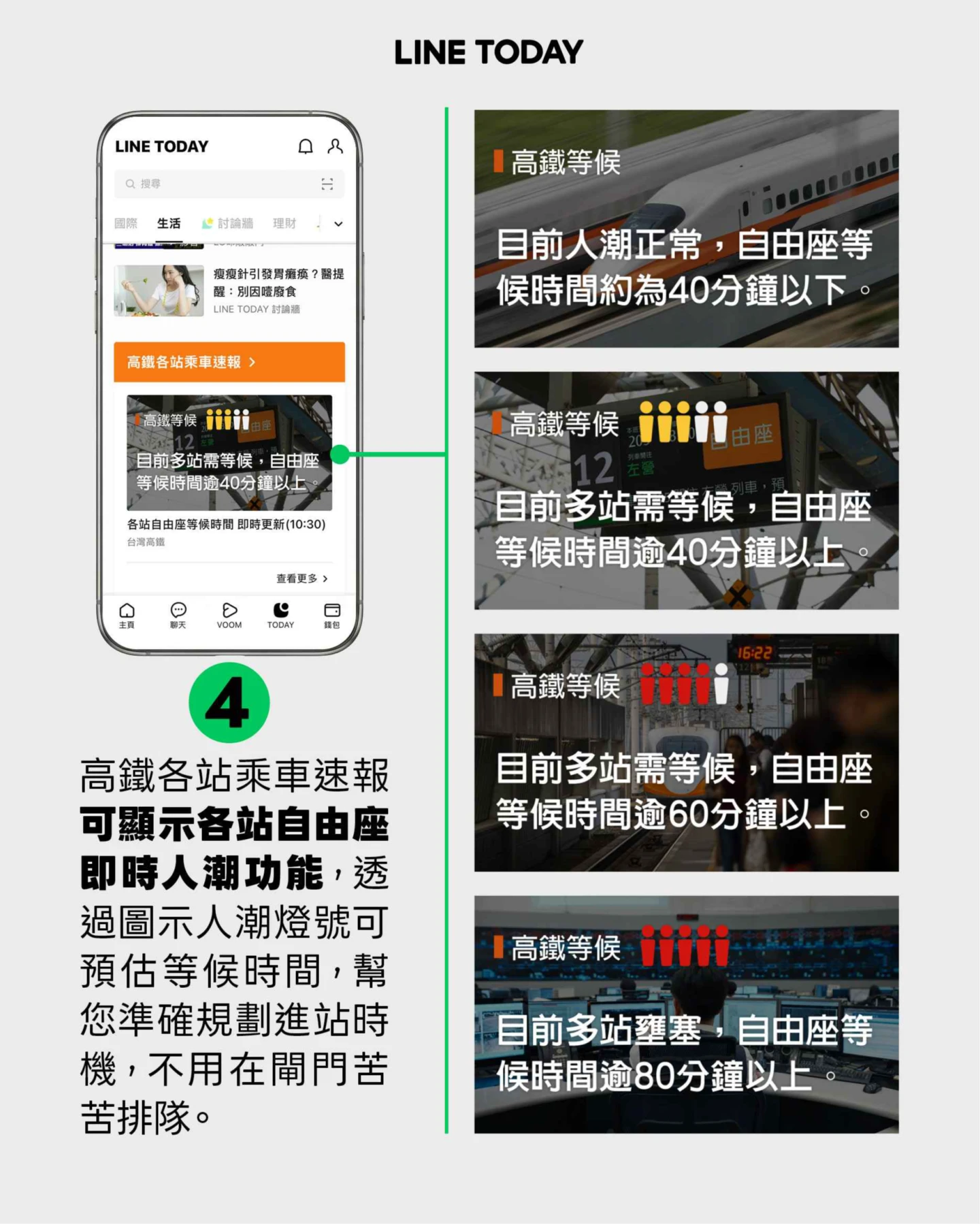 春節期間準備利用自由座的旅客,可透過高鐵企業網站、「T-EX行動購票」App查詢以及LINE TODAY「生活頻道」預先掌握當日各站預估自由座排隊等候時間,並優先選擇綠色燈號的時段搭車,即可避開尖峰人潮、節省寶貴時間,享受更加順暢、舒適的高鐵旅程。