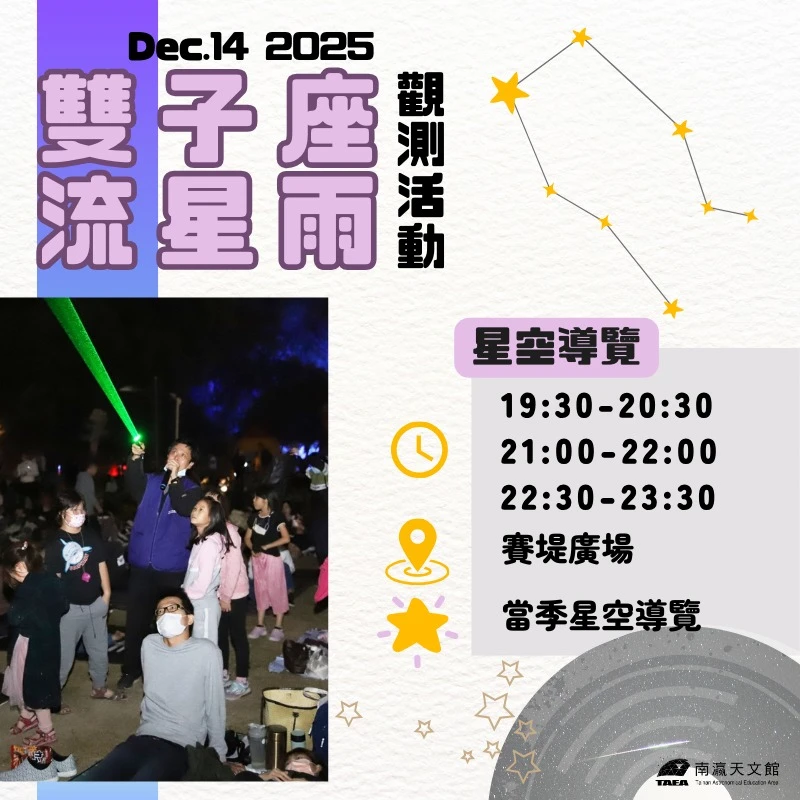 南瀛天文館也推出觀星活動,14日晚間6時起進行「雙子座流星雨野台講座」,以望遠鏡觀測星空,並安排三場「星空導覽解說」。特別提醒民眾務必備妥保暖衣物及用品,建議攜帶野餐墊享受最舒適的「躺看」體驗,以及乾抹布應對夜間濕氣。