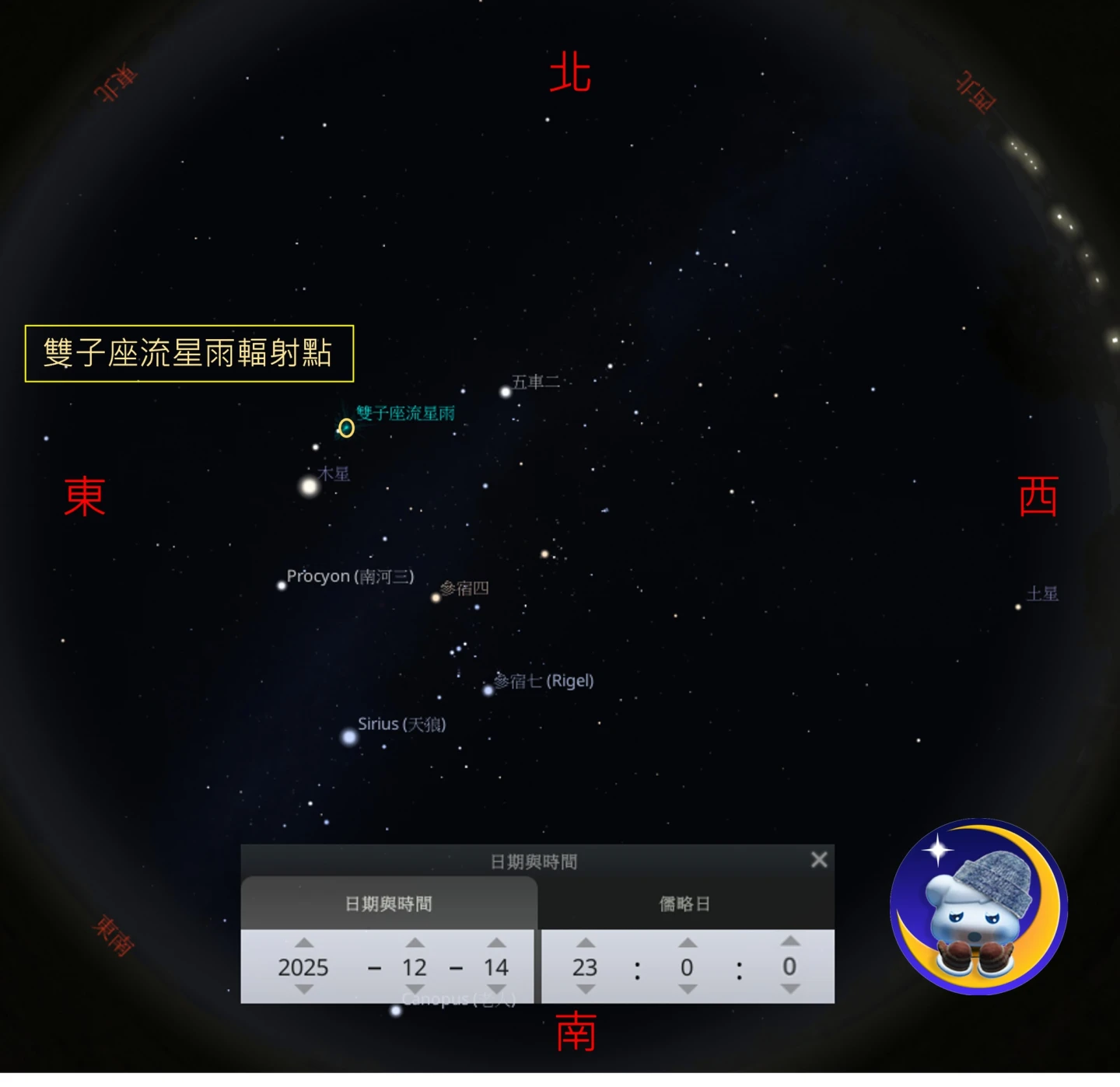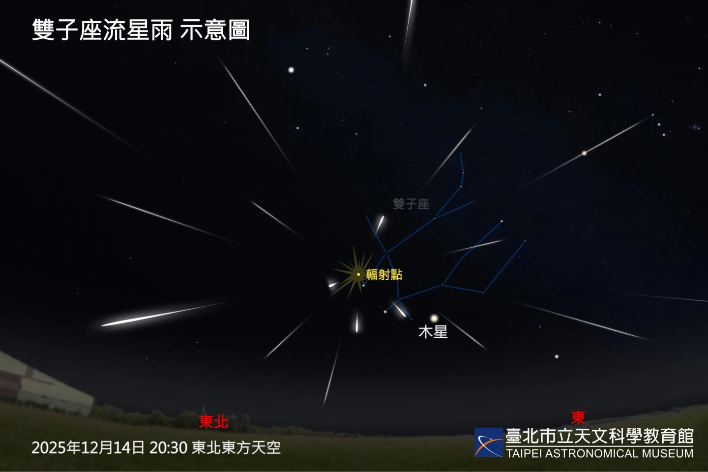 台北天文館表示,14日晚間19時30分左右,當雙子座流星雨的輻射點從東北方升起後,流星數量將逐漸增多。由於殘月要到次日凌晨2時30分才升起,前半夜幾乎完全沒有月光干擾,是極佳的觀賞時段。