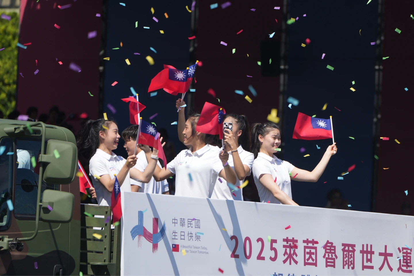 114年國慶大會少棒英雄車隊進場,2025德國萊茵魯爾世大運代表團揮舞國旗向民眾致意。陳卓邦攝