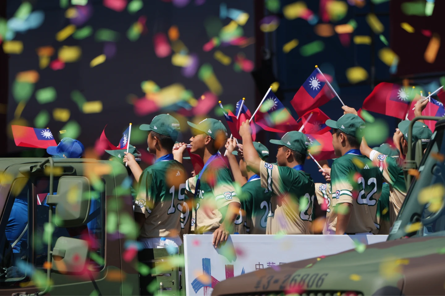 緊接著,多支在國際賽事表現優異的隊伍搭乘英雄車隊進場接受致敬,包括2025德國萊茵魯爾世大運代表團、成都世運代表團、世界次青少棒錦標賽冠軍台中市立中山國中棒球隊,以及威廉波特世界少棒聯盟錦標賽總冠軍台北市立東園國小少棒隊選手。