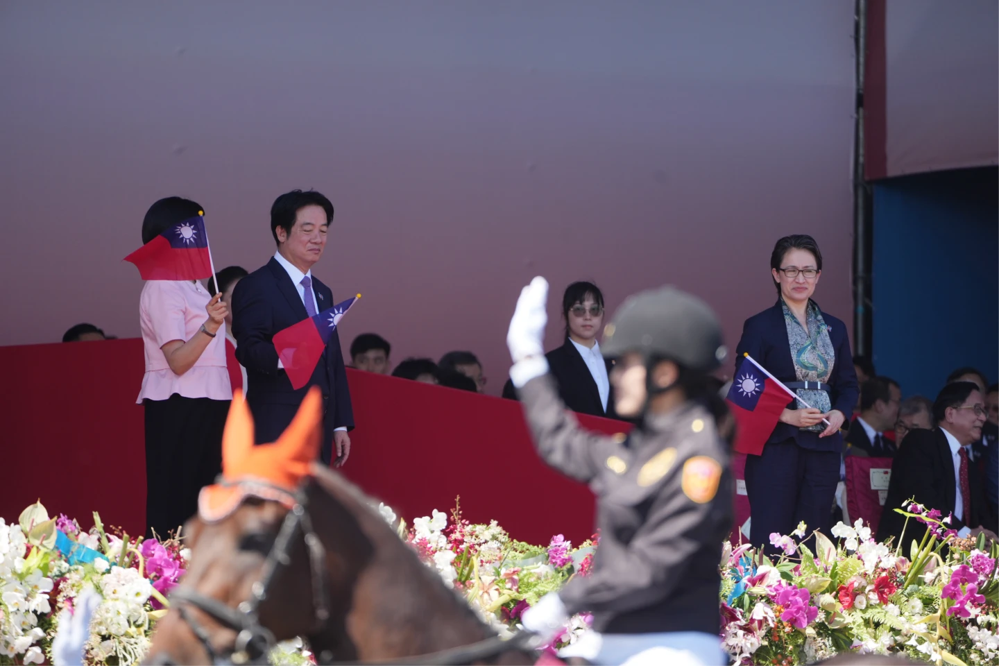 總統賴清德夫婦(左)以及副總統蕭美琴(右),一同在114年國慶大會典禮台上檢閱新北市警察局騎警隊與憲兵指揮部快速反應連車隊前導隊伍。陳卓邦攝