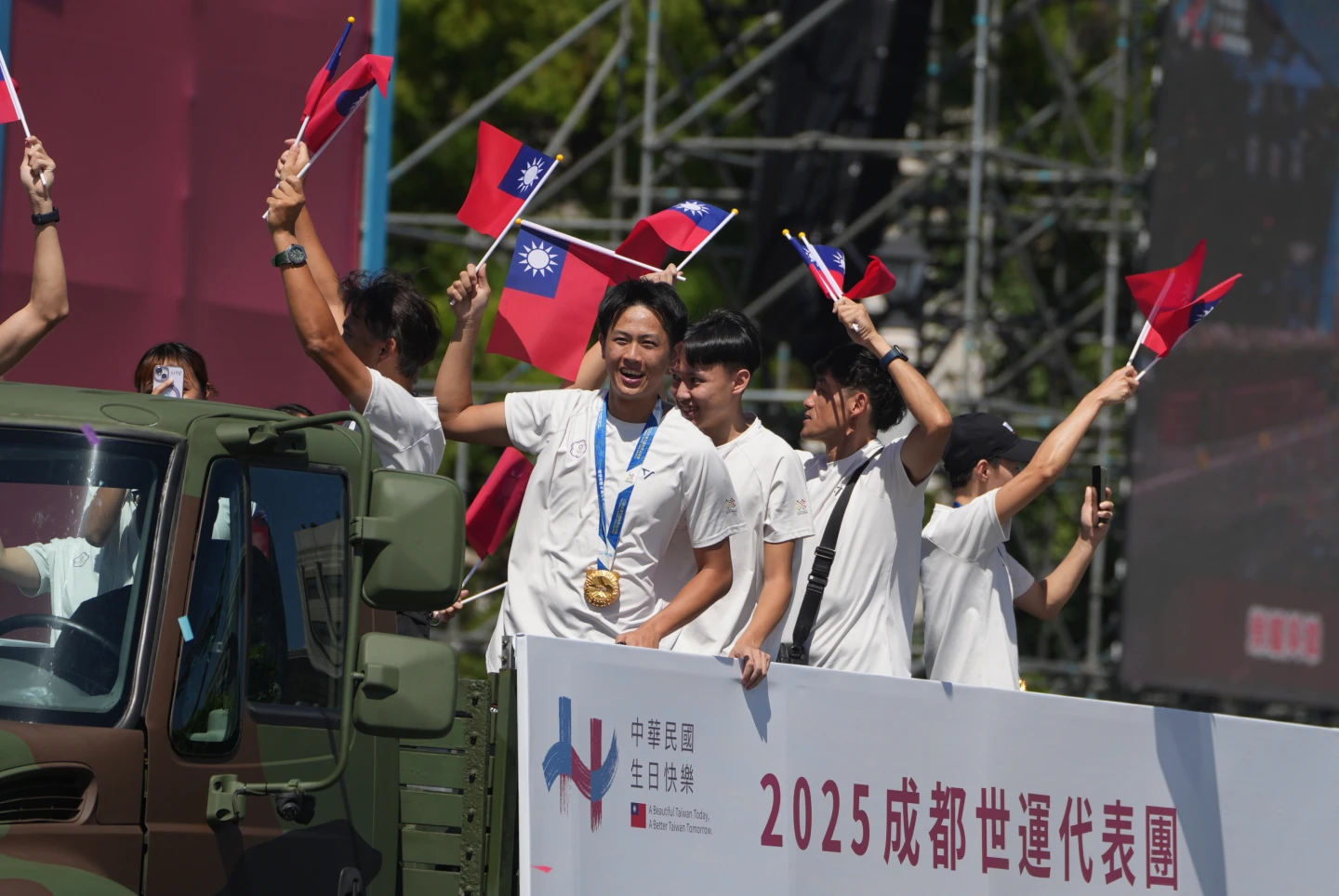 114年國慶大會少棒英雄車隊進場,成都世運代表團揮舞國旗向民眾致意。陳卓邦攝