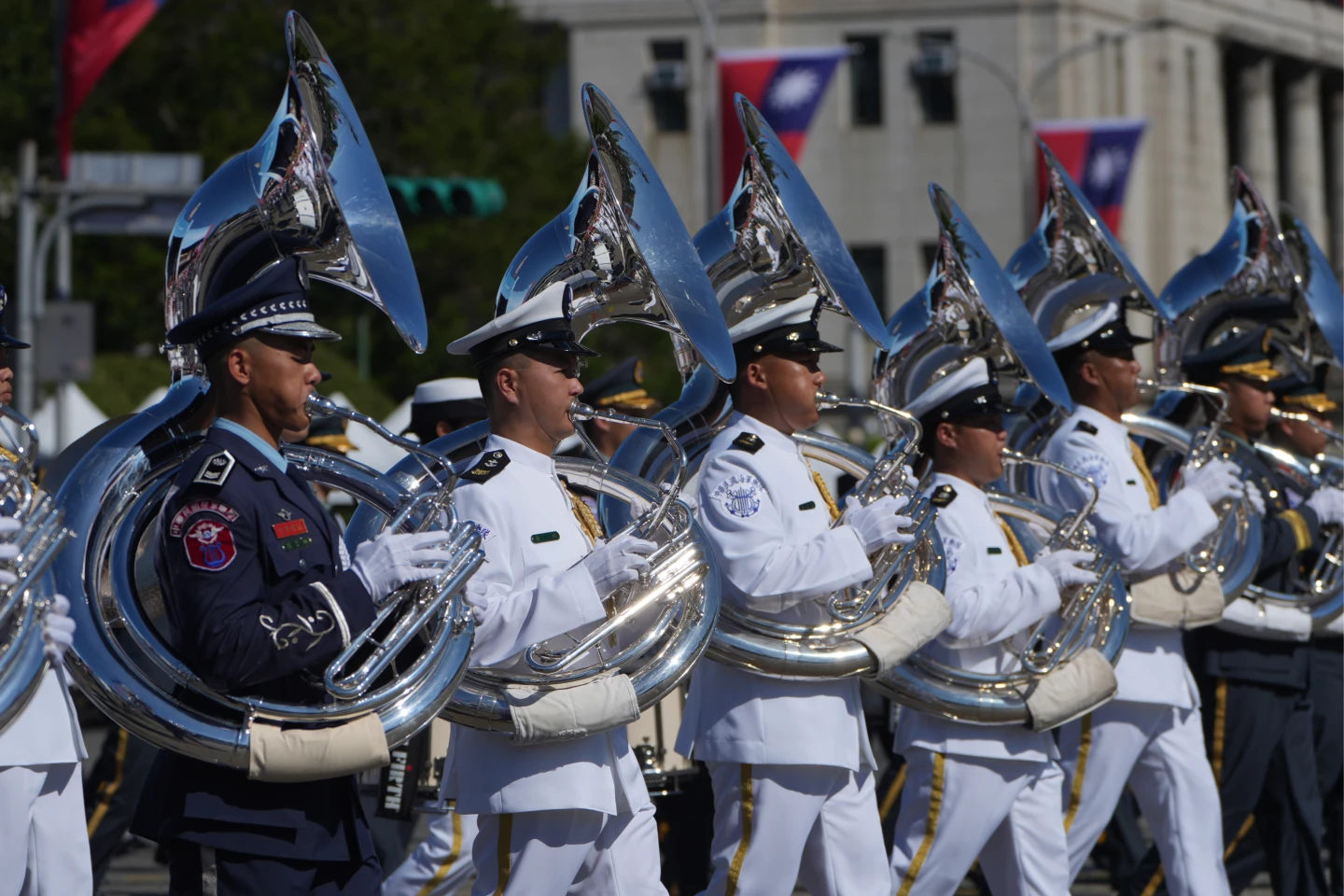 國防部聯合樂隊暨三軍儀隊以「樂儀齊鳴震八方 戮力同心護家邦」,在114國慶大會獲得滿堂彩。陳卓邦攝