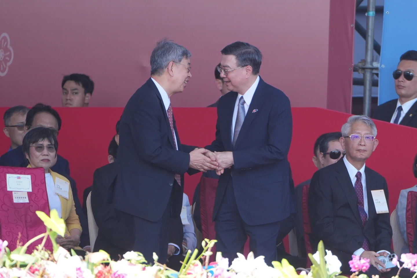 114年國慶大會典禮台上,陳建仁(前排左)與卓榮泰(前排中)相互握手致意。陳卓邦攝