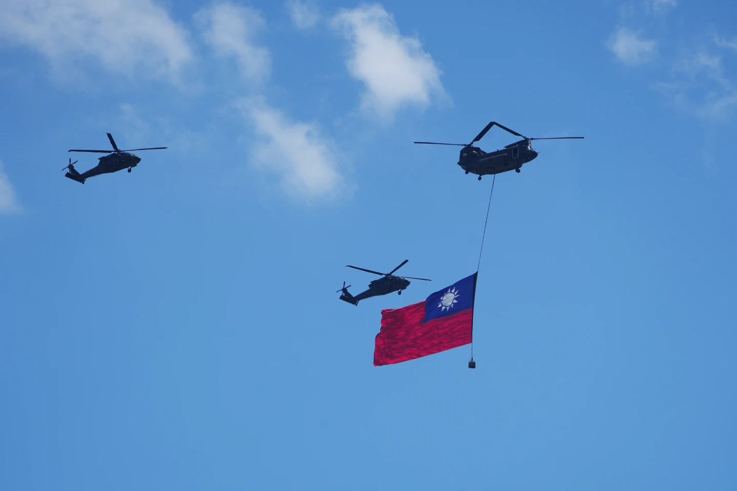 114年國慶大會,契努克直升機吊掛巨幅國旗飛越總統府。陳卓邦攝