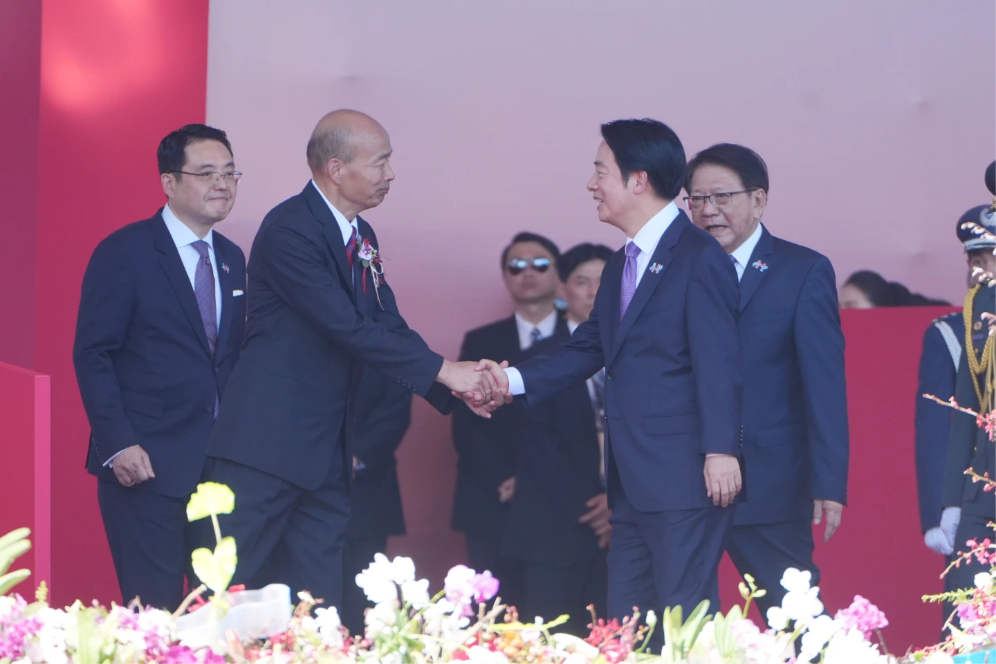 114年國慶大會典禮,韓國瑜(前排左)與賴清德先禮後兵,雙方先是滿臉笑容握手致意,卻又在致詞演說時言詞交鋒。陳卓邦攝