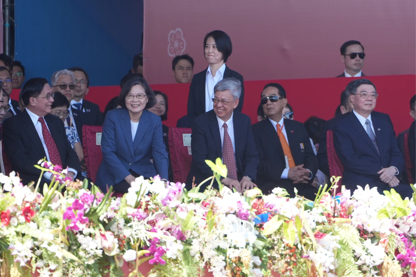 114年國慶大會典禮上,前總統陳水扁(由左至右)、蔡英文、前副總統陳建仁、親民黨主席宋楚瑜、行政院長卓榮泰等人受邀出席。陳卓邦攝