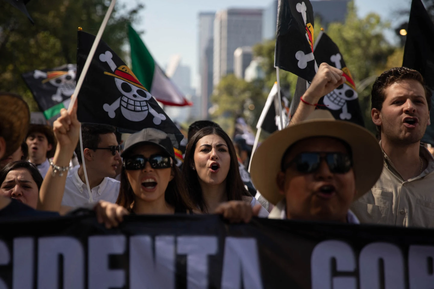 參與遊行的民眾中,有人舉著日本動漫《航海王》(One Piece)的海賊旗,這旗幟已成為全球年輕人抗議的象徵。許多人手持「我們都是曼索(Carlos Manzo)」標語,向本月1日遇害的米卻肯州烏魯阿潘市(Uruapan)反毒市長曼索致敬。不過,曼索的遺孀已和周六的抗議活動者劃清界線。