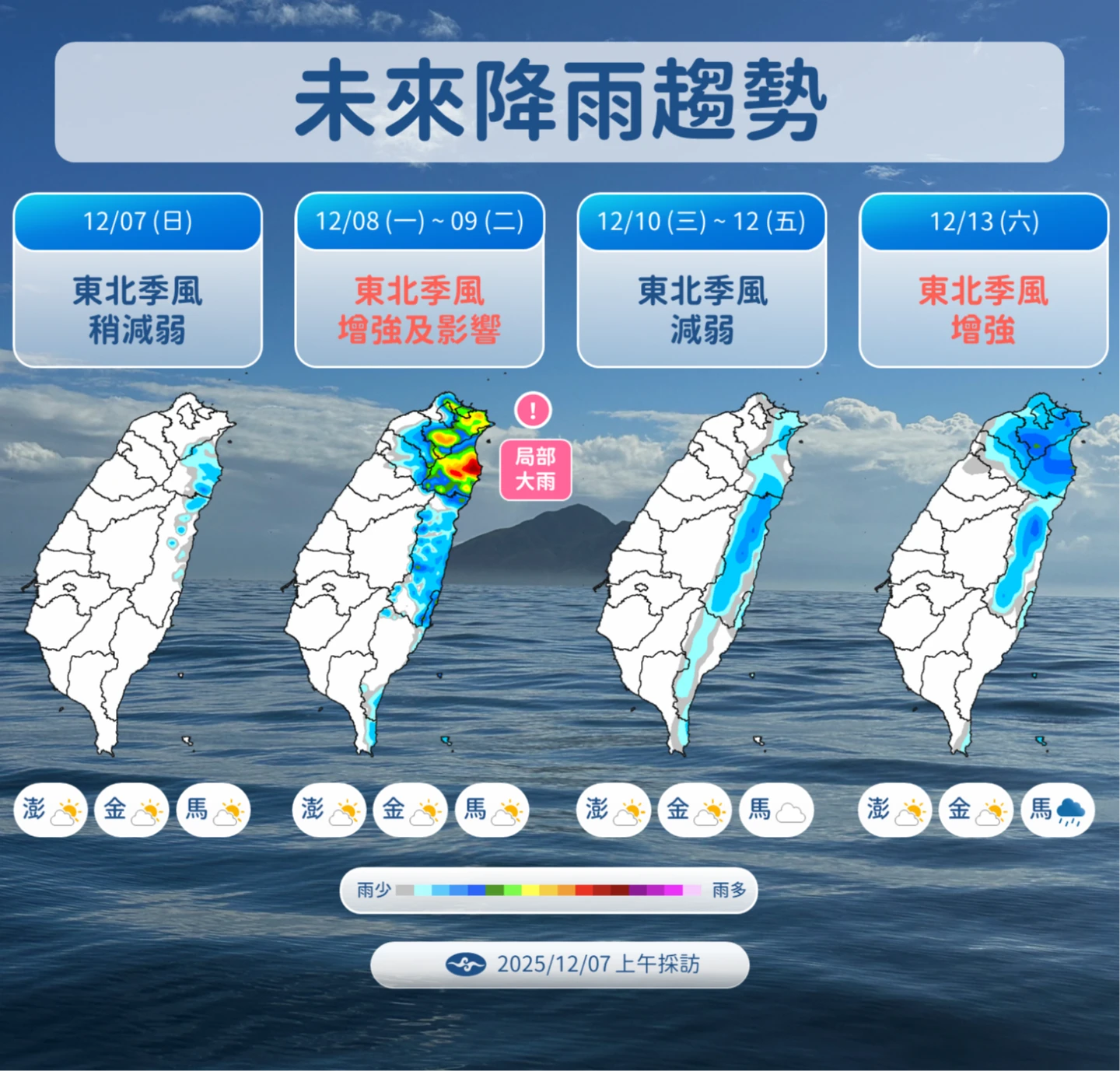 劉沛滕說明,周三(10日)至周五(12日)受東北季風減弱影響,各地天氣將好轉,大致為多雲到晴,僅東半部部分迎風面有零星降雨,各地氣溫也會隨之回升,白天感受舒適微熱,早晚偏涼。劉沛滕預告,下一波東北季風將在周六(13日)再次增強,北部、東半部轉為有局部短暫雨的天氣。