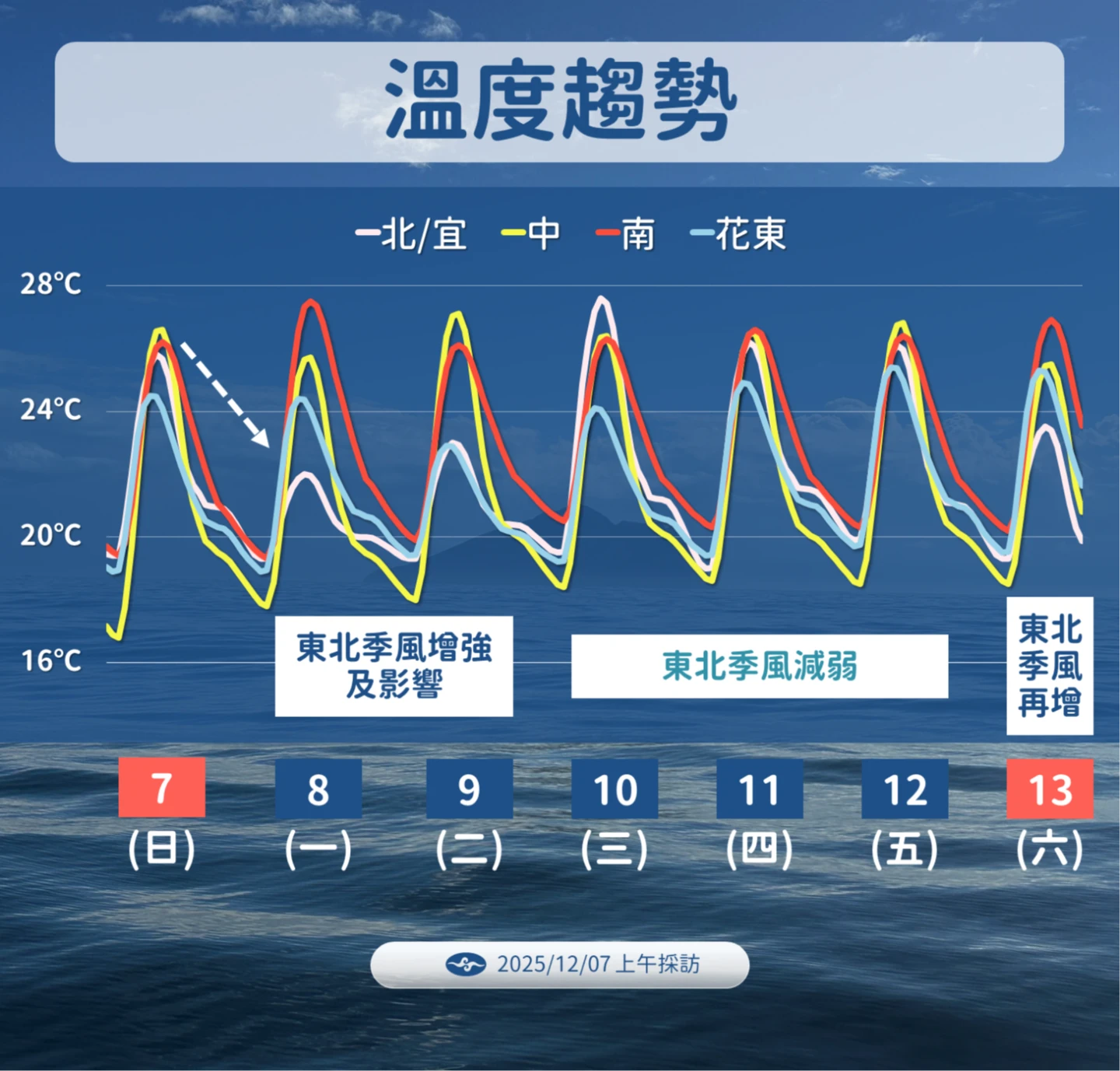 【記者陳力維/綜合報導】中央氣象署表示,今(7)日東北季風減弱,全台大部分地區天氣為多雲到晴,僅東半部地區有局部零星降雨,宜蘭及基隆北海岸也有少量降雨機率。預報員劉沛滕指出,受季風減弱影響,今天各地低溫約攝氏14到20度,高溫則可達25到28度。不過,本周將有兩波東北季風接連影響台灣,明後天北台灣3地區轉有雨,接著氣候回穩後,周六入冬最低溫來襲,強度直逼大陸冷氣團,天氣變化大,民眾需特別留意。氣象專家吳德榮則指出,本周末本島平地的最低氣溫亦將挑戰10度以下。